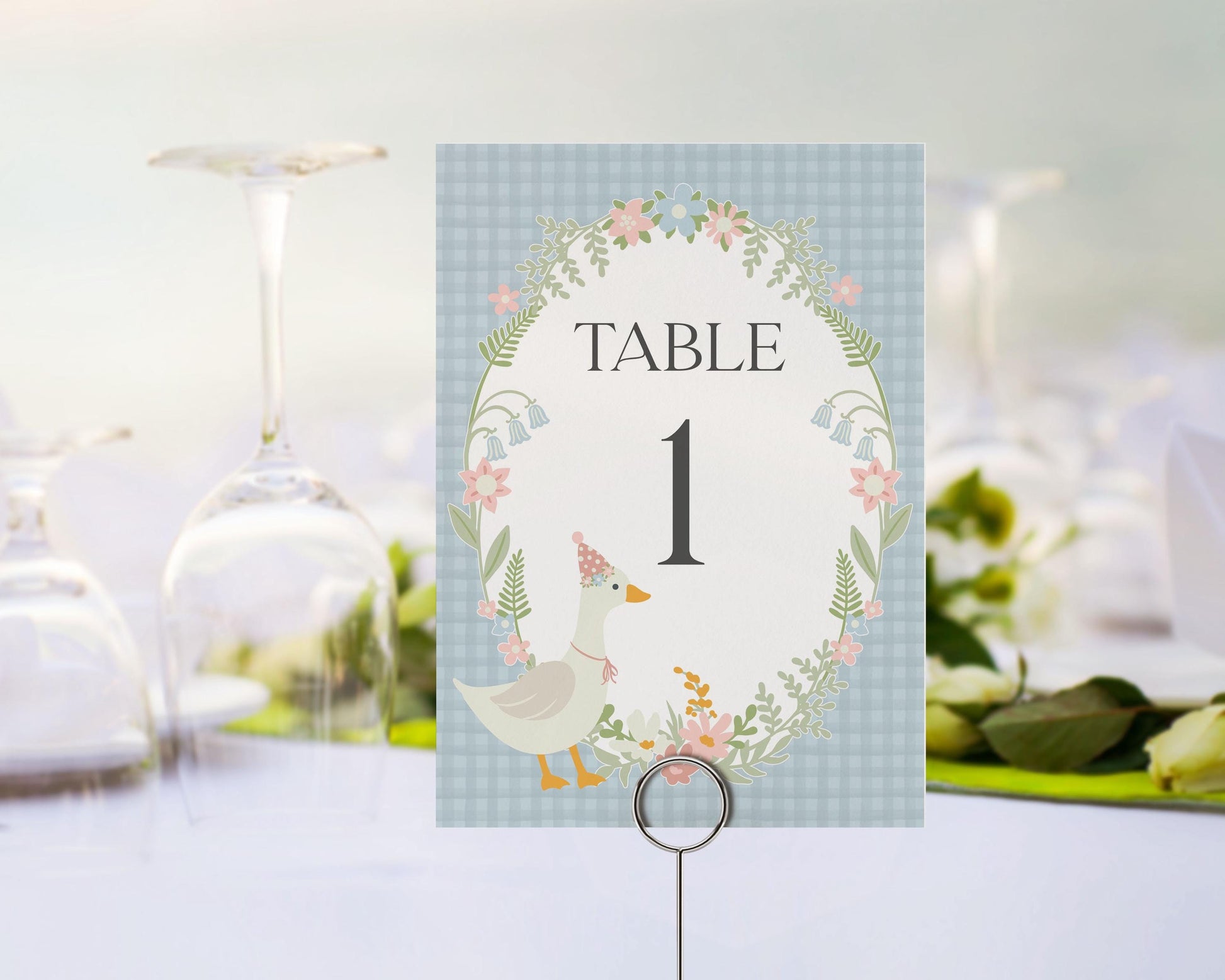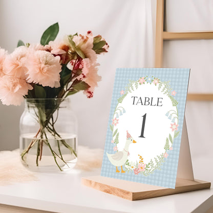 Blue Floral Silly Goose Table Number Cards Printable Template, Little Duck Theme Girl Birthday, Pastel Gingham Baby Shower Sprinkle WP1023