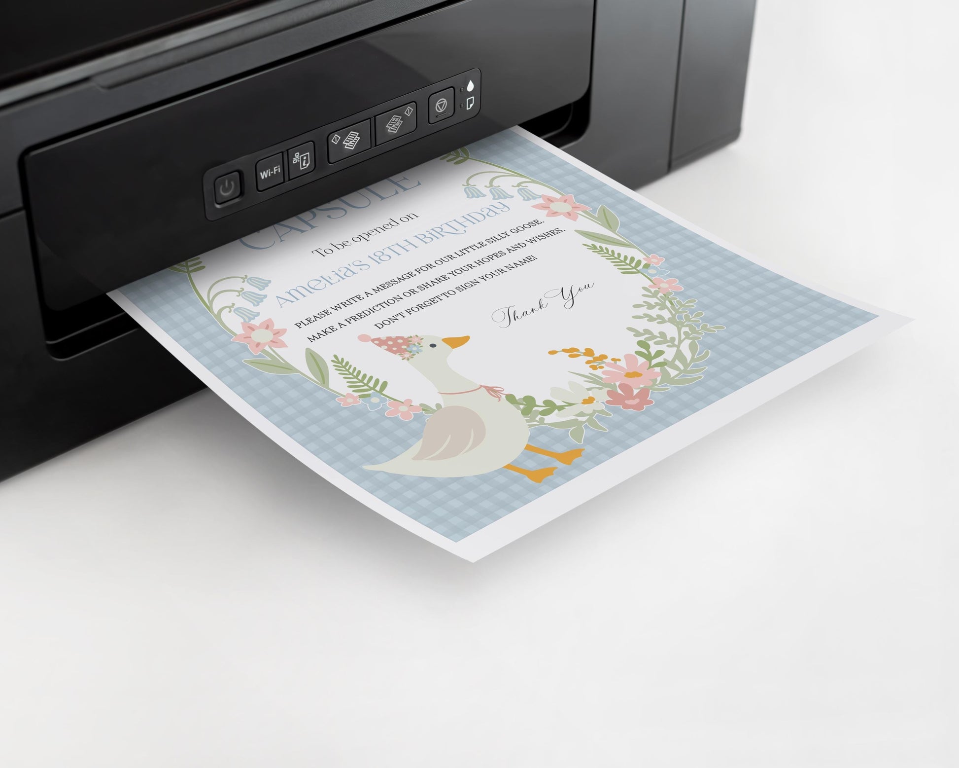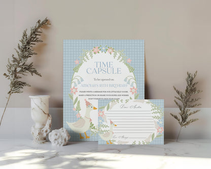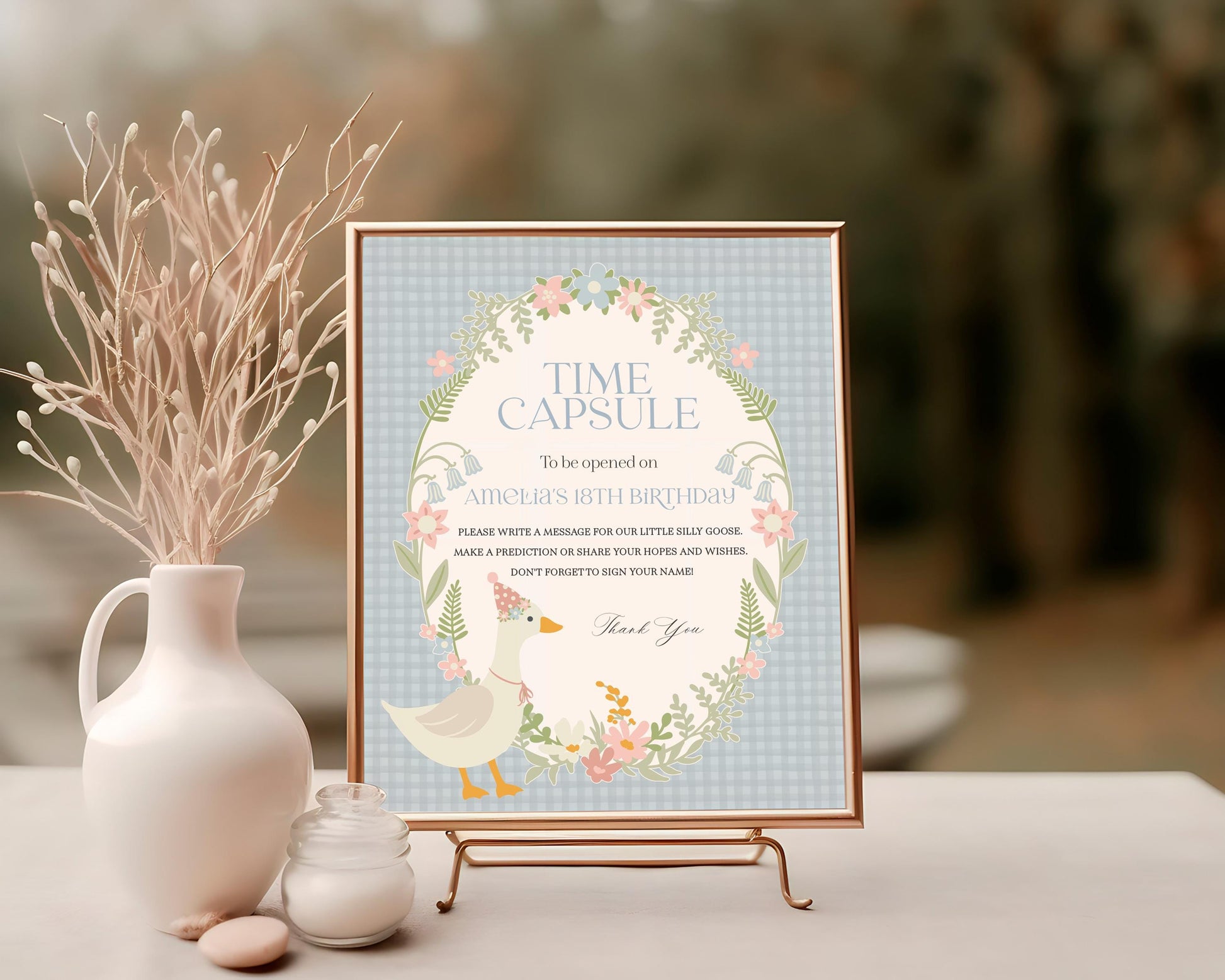 Blue Floral Silly Goose Time Capsule Printable Template, Little Duck Theme Birthday for Girl, Pastel Floral Gingham Birthday Decor WP1023