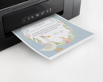 Blue Floral Silly Goose Baby Shower Diaper Thoughts Printable Template, Little Duck Theme Shower Girl, Pastel Gingham Baby Sprinkle WP1023