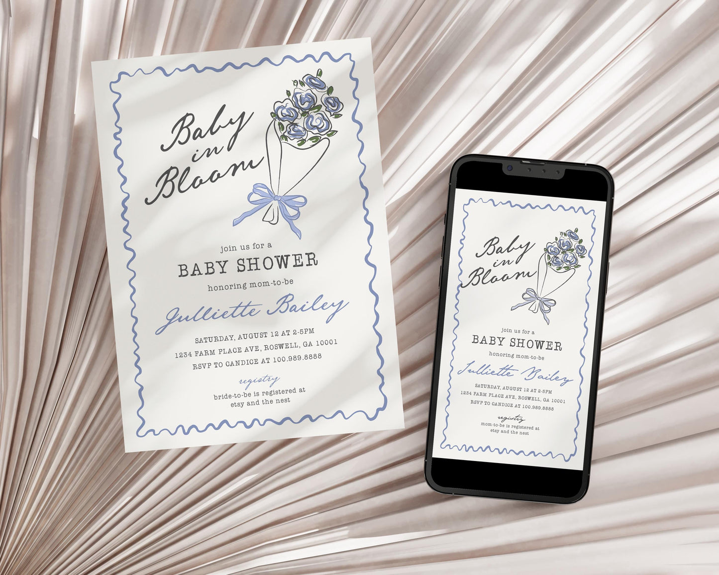 There is a Baby in Bloom! Celebrate your mom-to-be with this fanciful bouquet of hand-drawn florals. This fresh floral theme is inspired by the charm of a French Flower Market, featuring fanciful wildflower doodles tied with a delicate blue coquette bow.