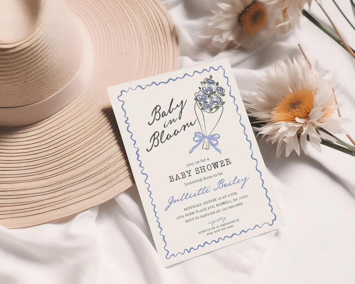 Blue Flower Market Baby Shower Invitation Template, Baby in Bloom Baby Sprinkle Girl, Locally Grown Hand Drawn Blue Coquette Floral WP1045