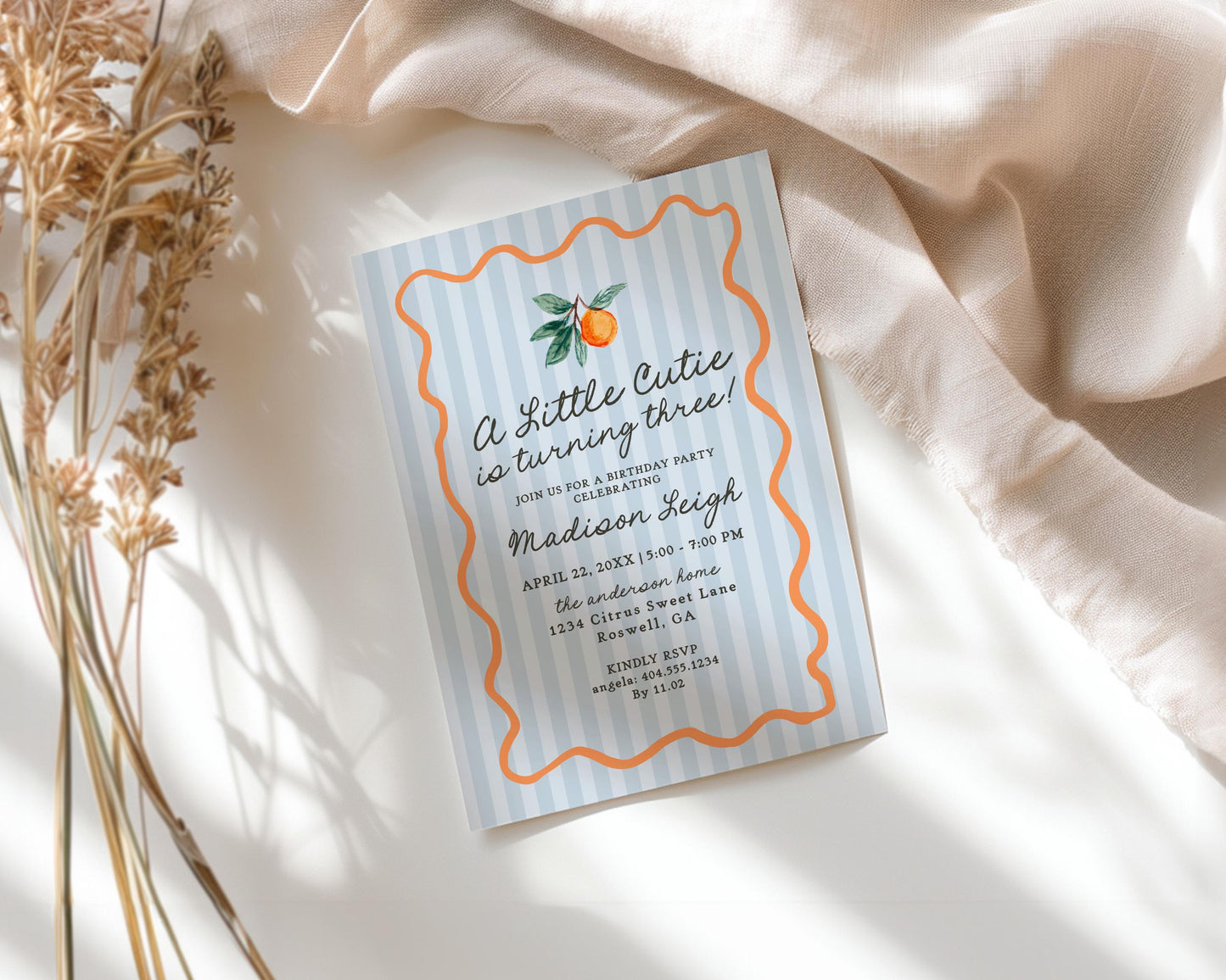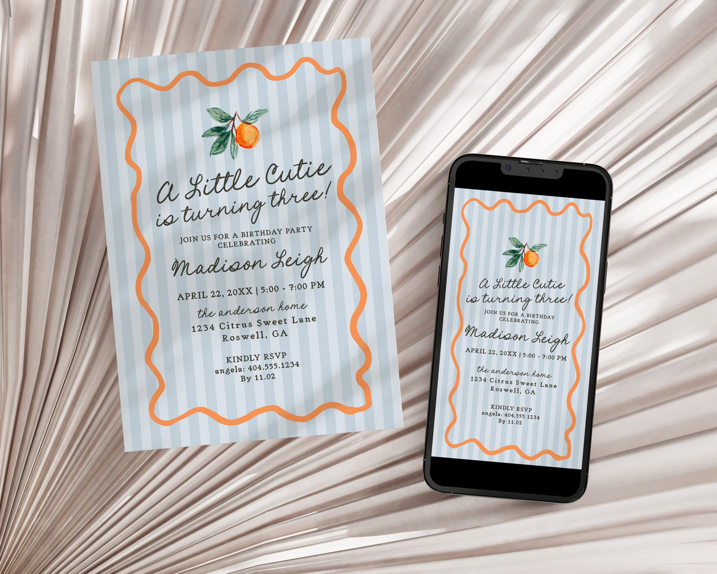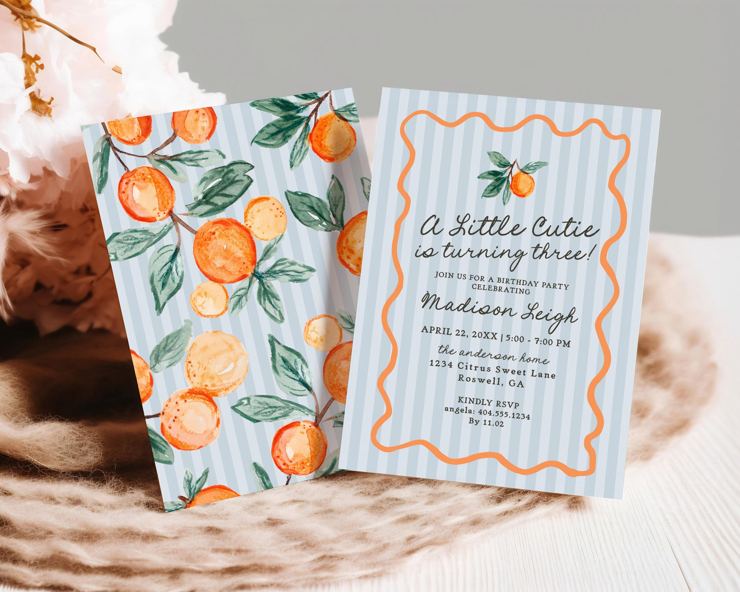 Blue Little Cutie Birthday Invitation Printable Template, Pastel Citrus Bday Party Decor for Retro Summer Birthday WP1052