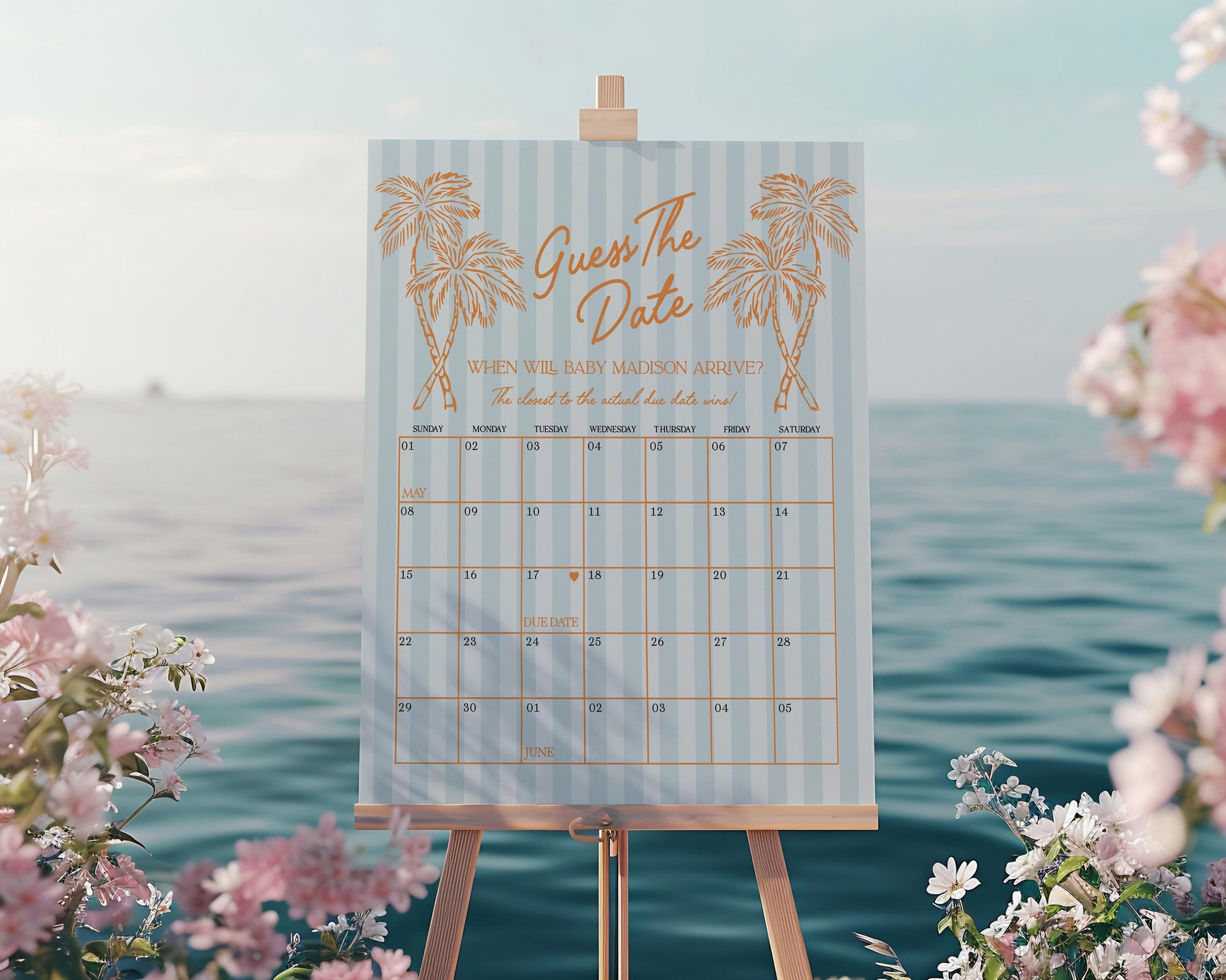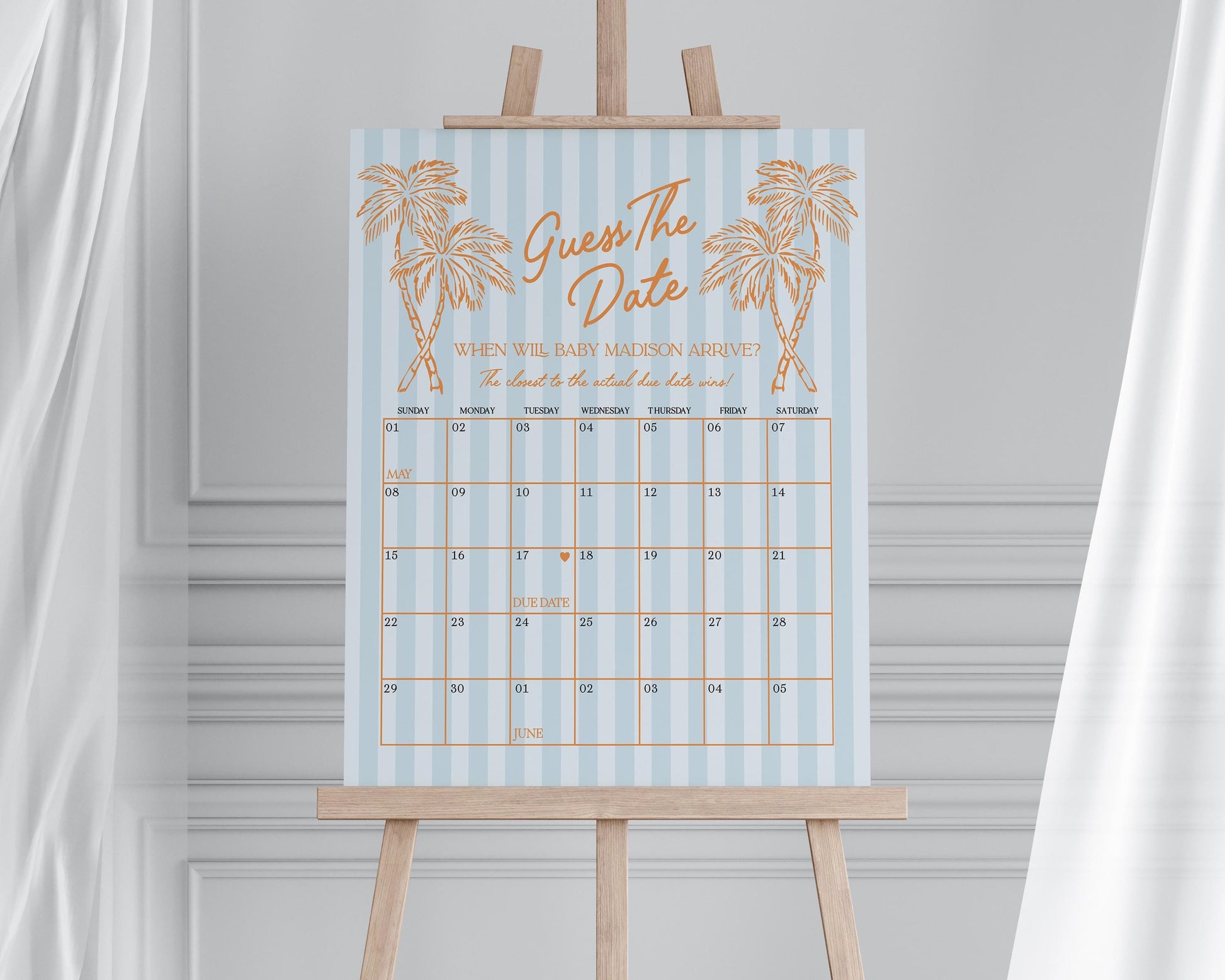Blue Palm Springs Baby Shower Guess the Date Game Template, Vintage Palm Tree Beach Cabana Baby Sprinkle, Retro Pastel Nesting Party WP1048