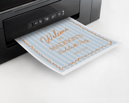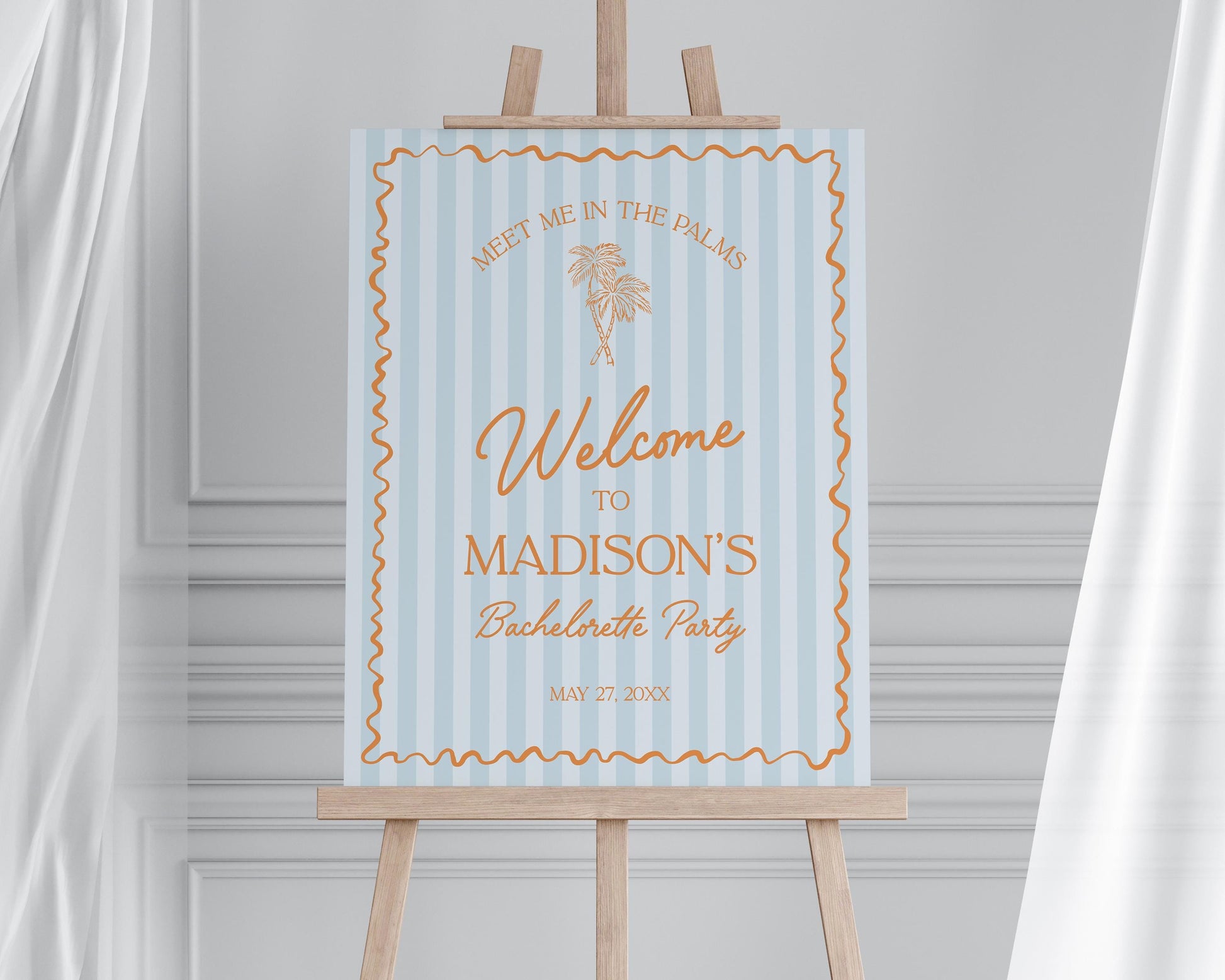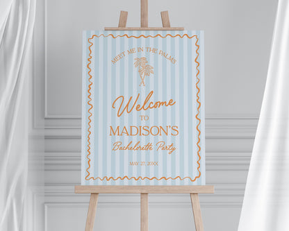 Blue Palm Springs Bachelorette Party Welcome Template, Vintage Palm Tree Beach Cabana Pool Party, Tropical Pastel Last Fling Bach WP1048