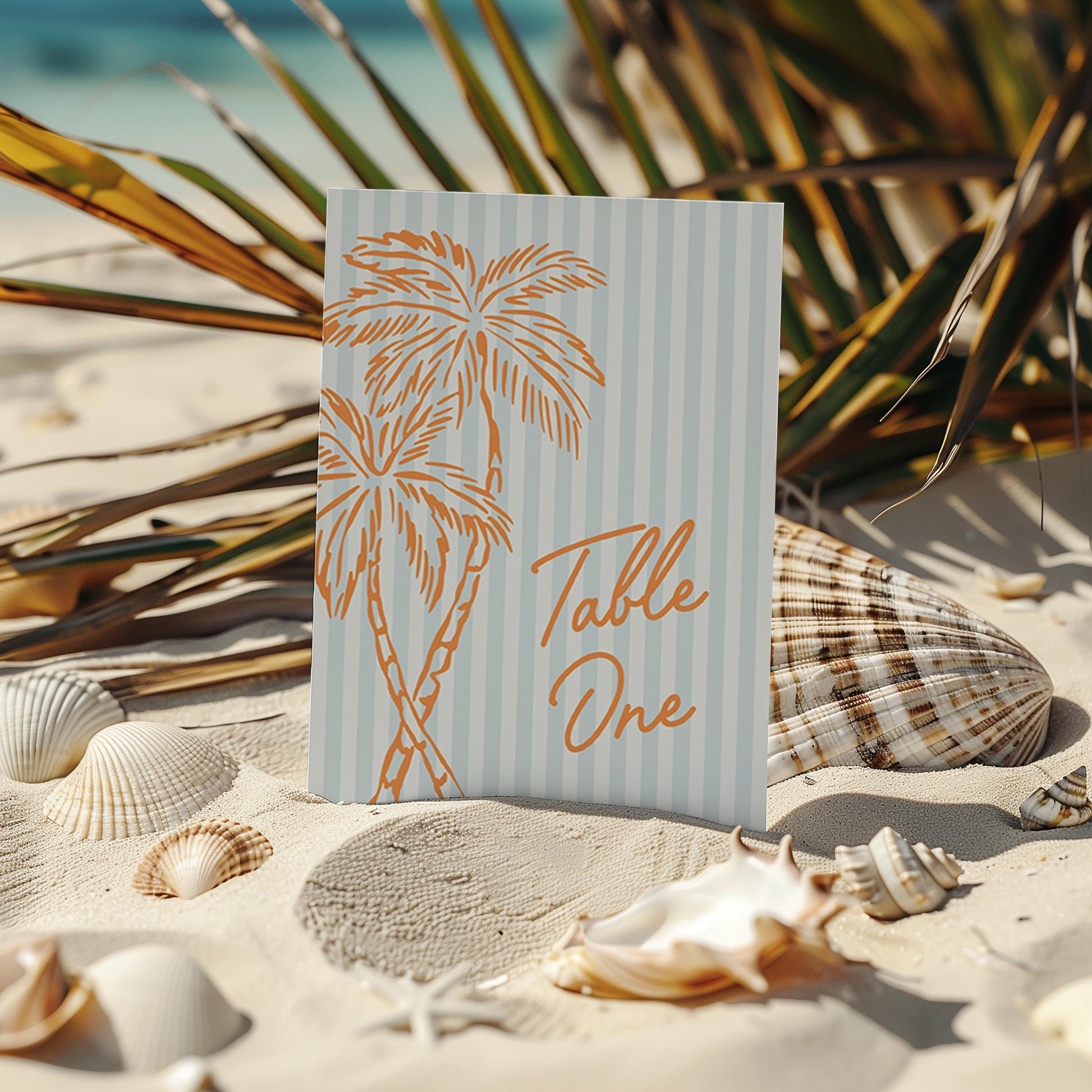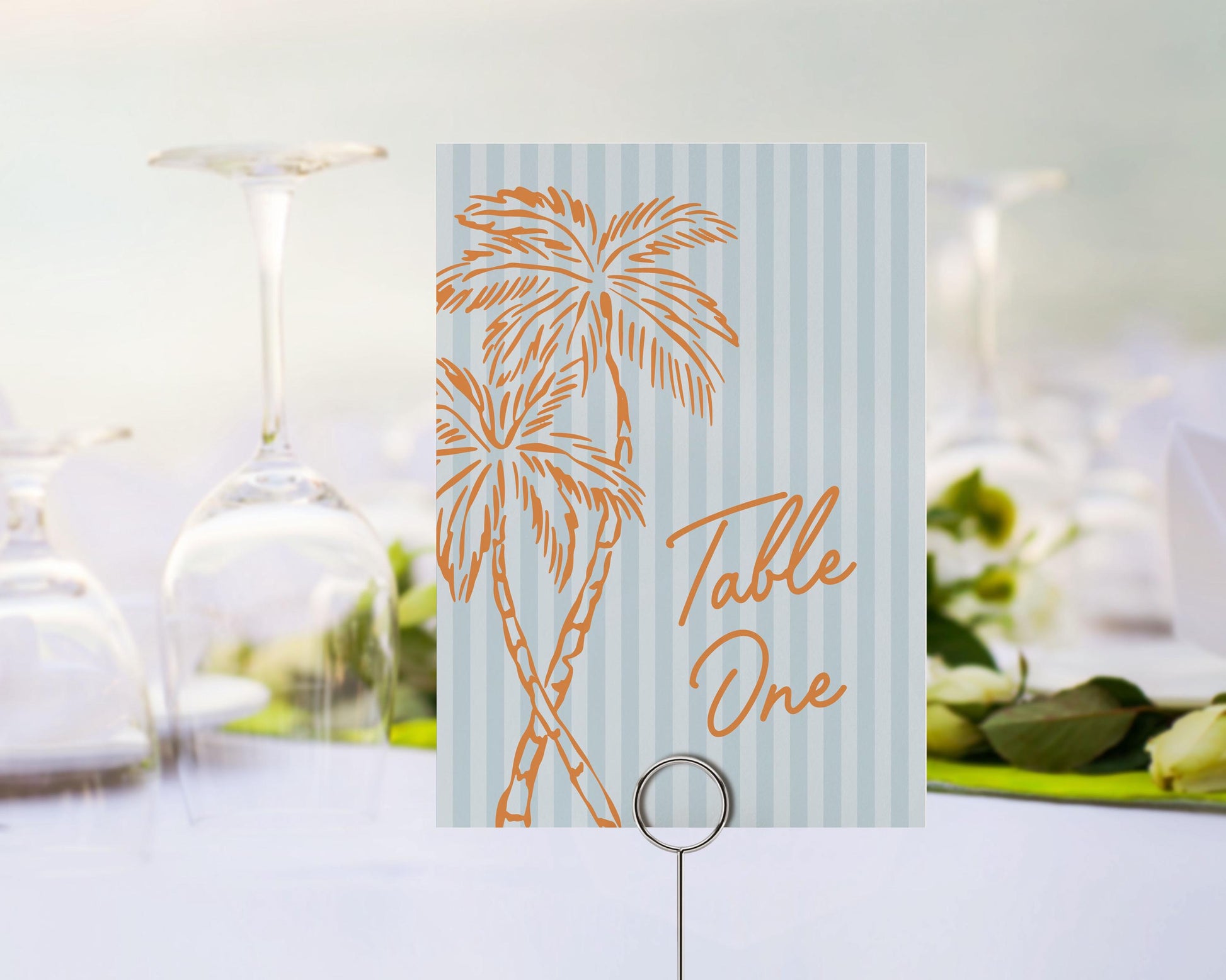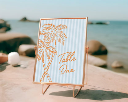 Blue Palm Springs Table Number Cards Template, Vintage Palm Tree Beach Cabana Birthday Pool Party, Tropical Pastel Bachelorette Theme WP1048