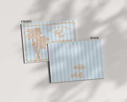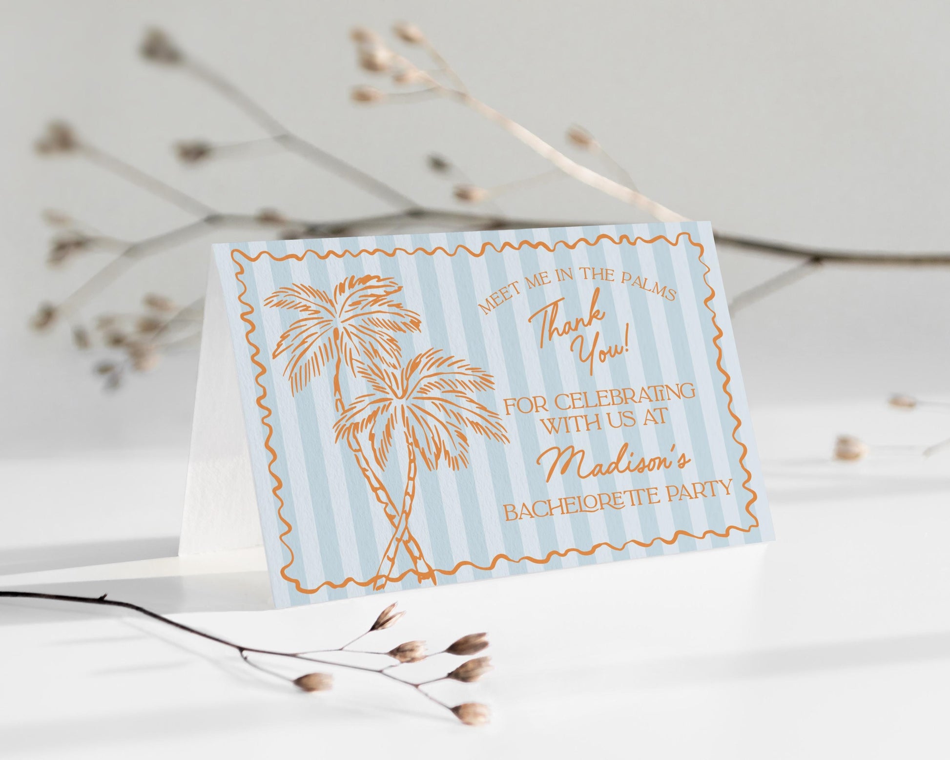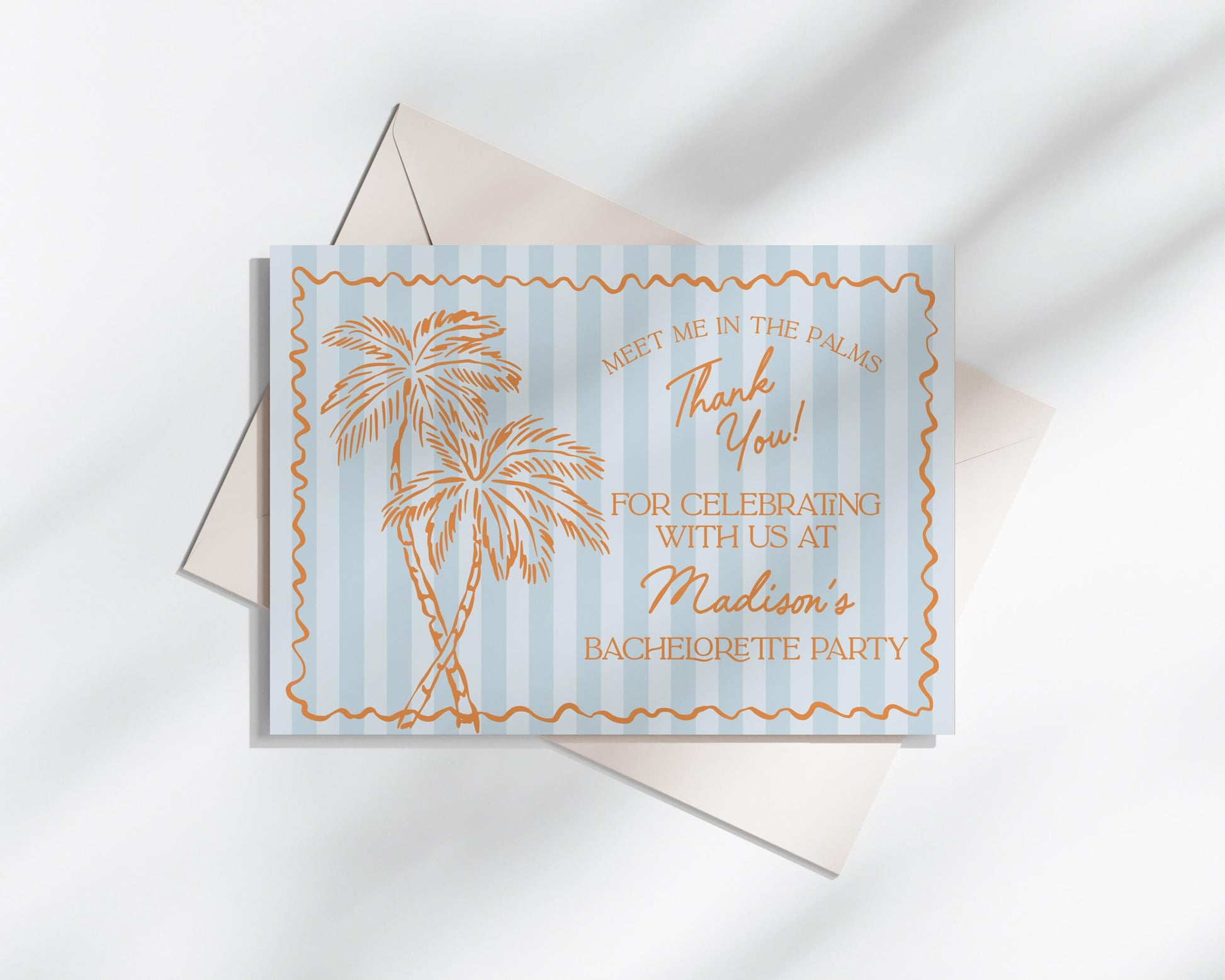 Blue Palm Springs Thank You Card Template, Vintage Palm Tree Beach Cabana Birthday Pool Party, Tropical Pastel Bachelorette Theme WP1048