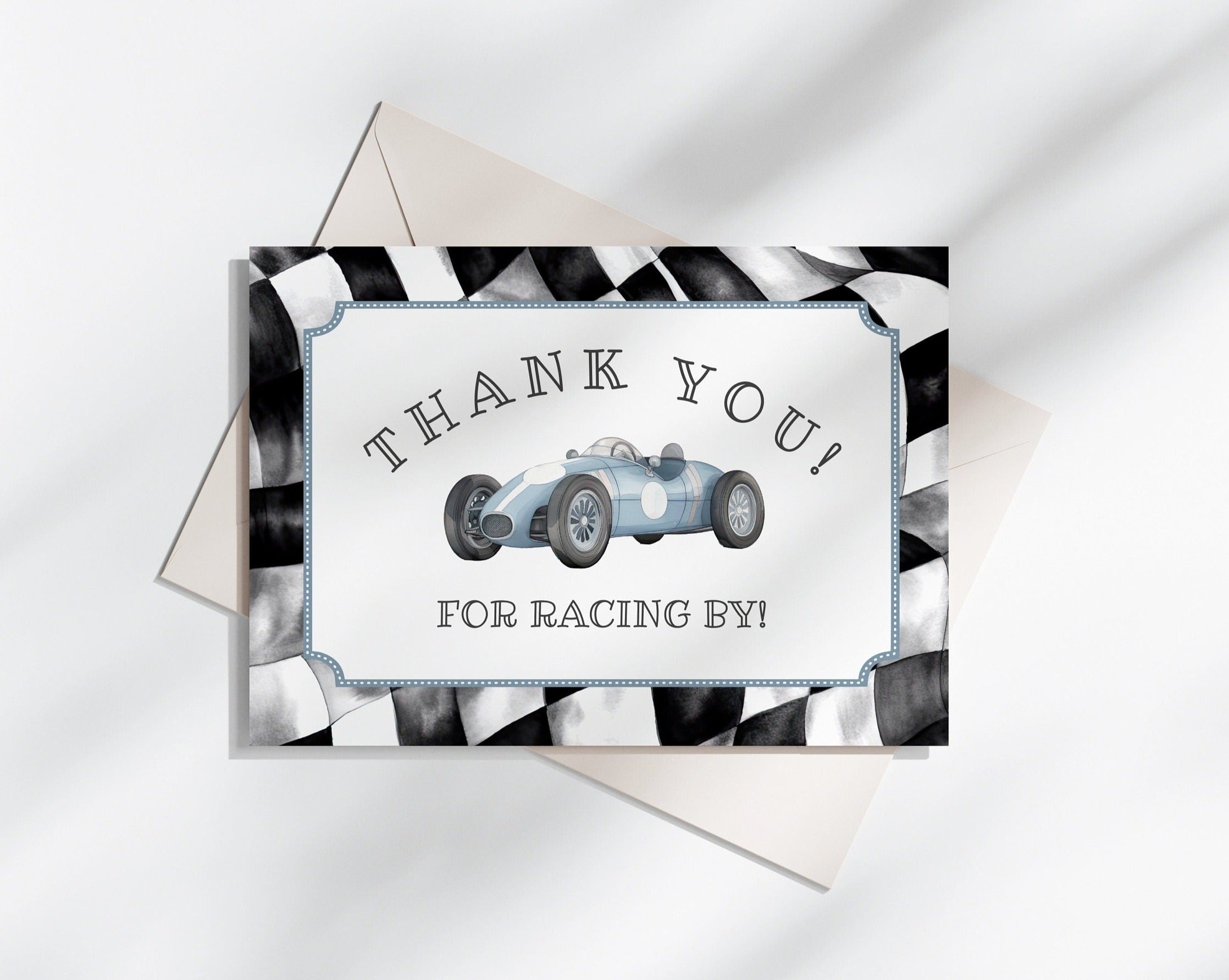 Blue Race Car Thank You Card Printable, instant download birthday or baby shower for boy our little racer is a fast one, growing up two fast