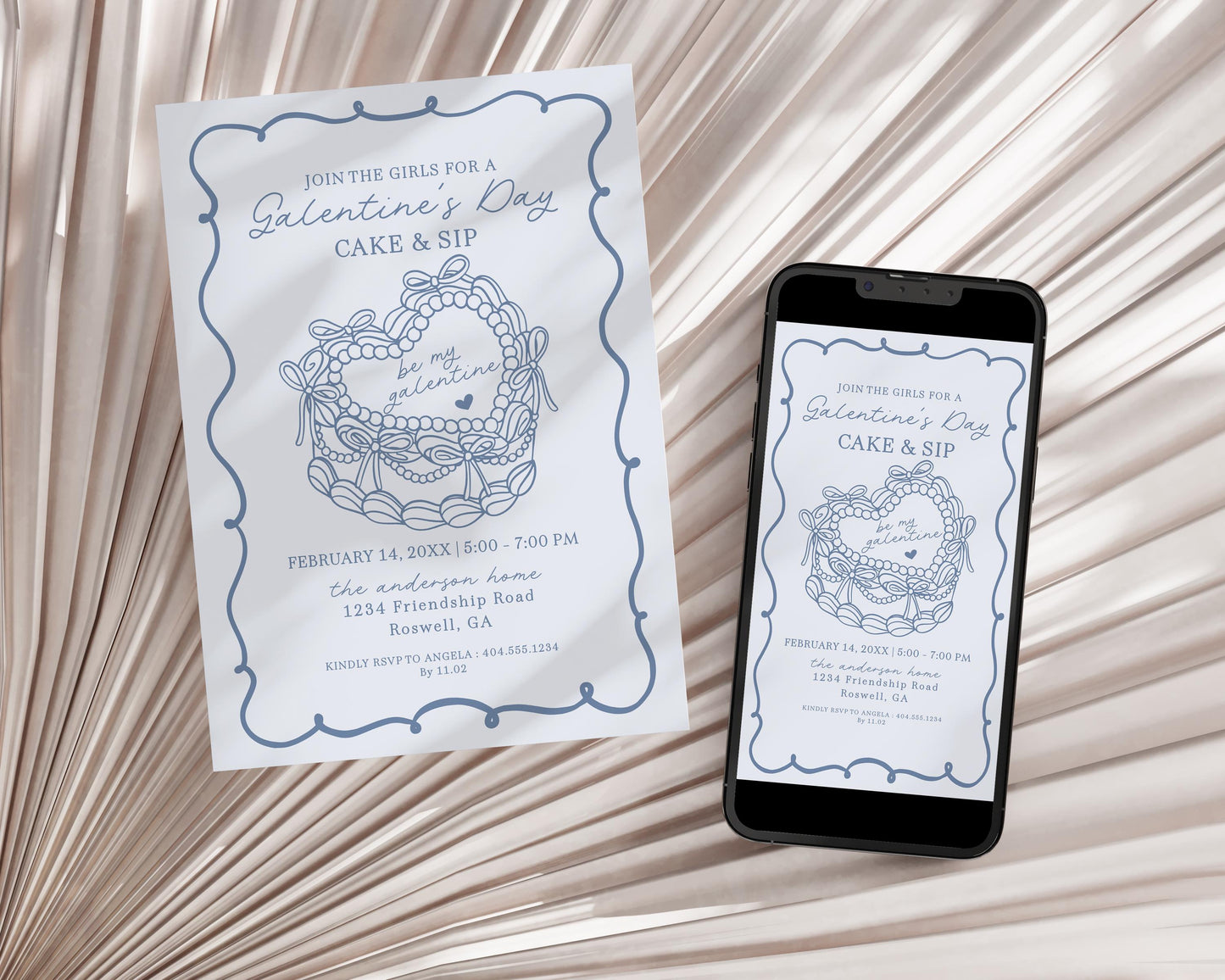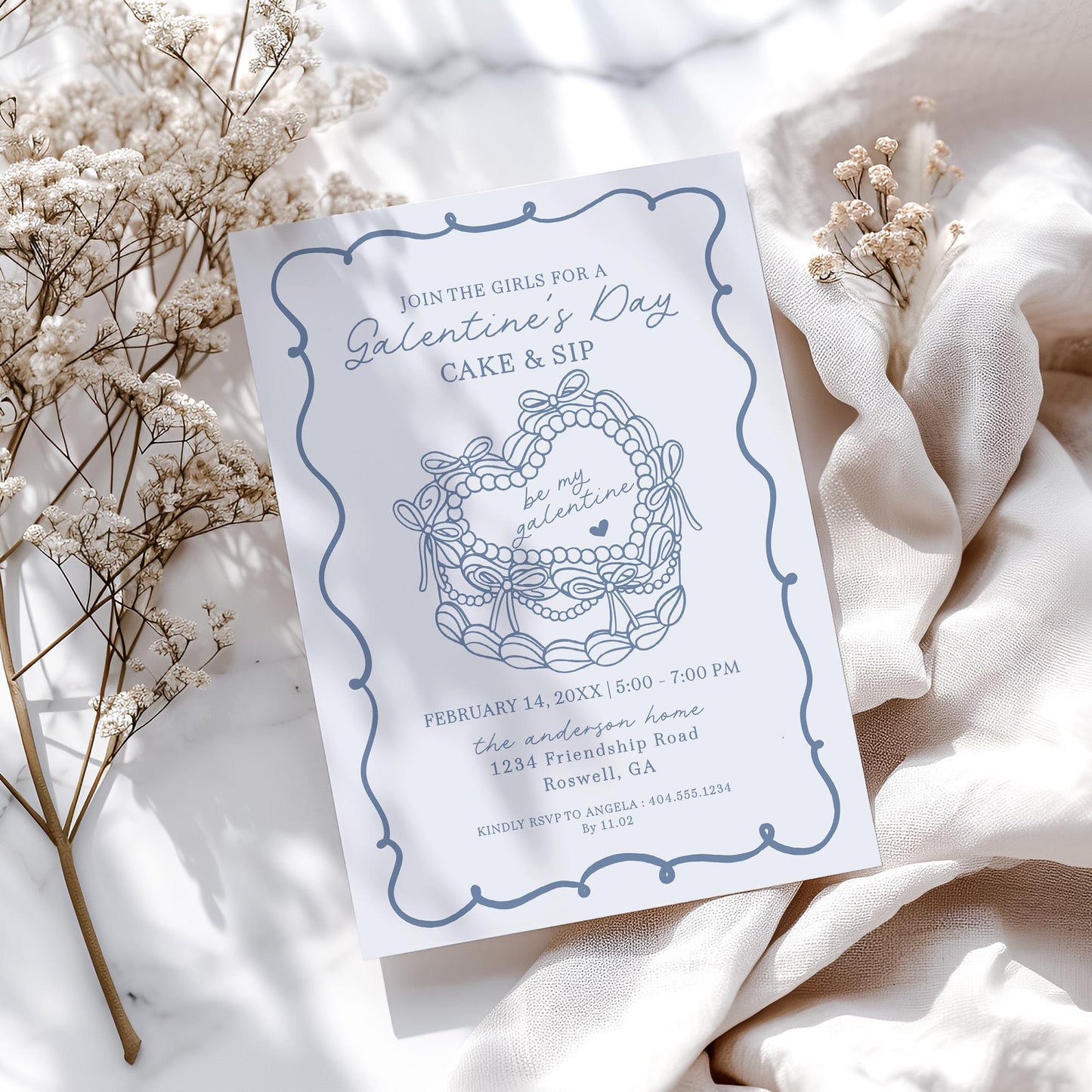 Blue Retro Coquette Heart Cake Galentine Party Invitation Template, Sweet Galentines Day Brunch, Blue Bow February Single Girls Night WP1034