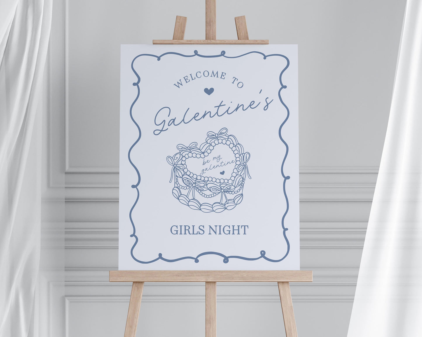 Blue Retro Coquette Heart Cake Galentines Party Welcome Sign Template, Galentines Day Brunch, Blue Bow February Singles Girls Night WP1034