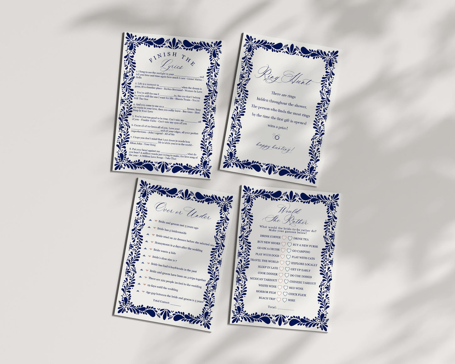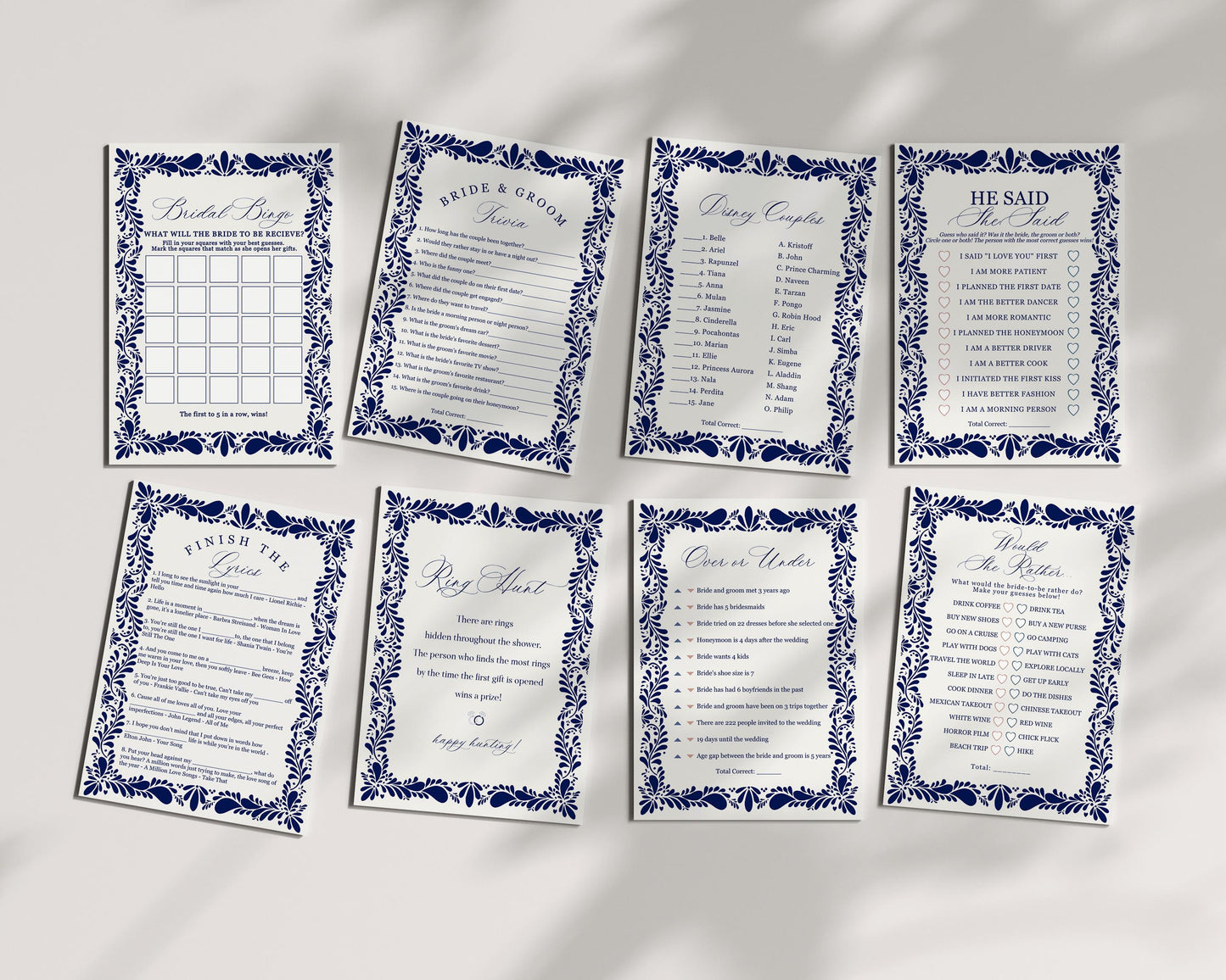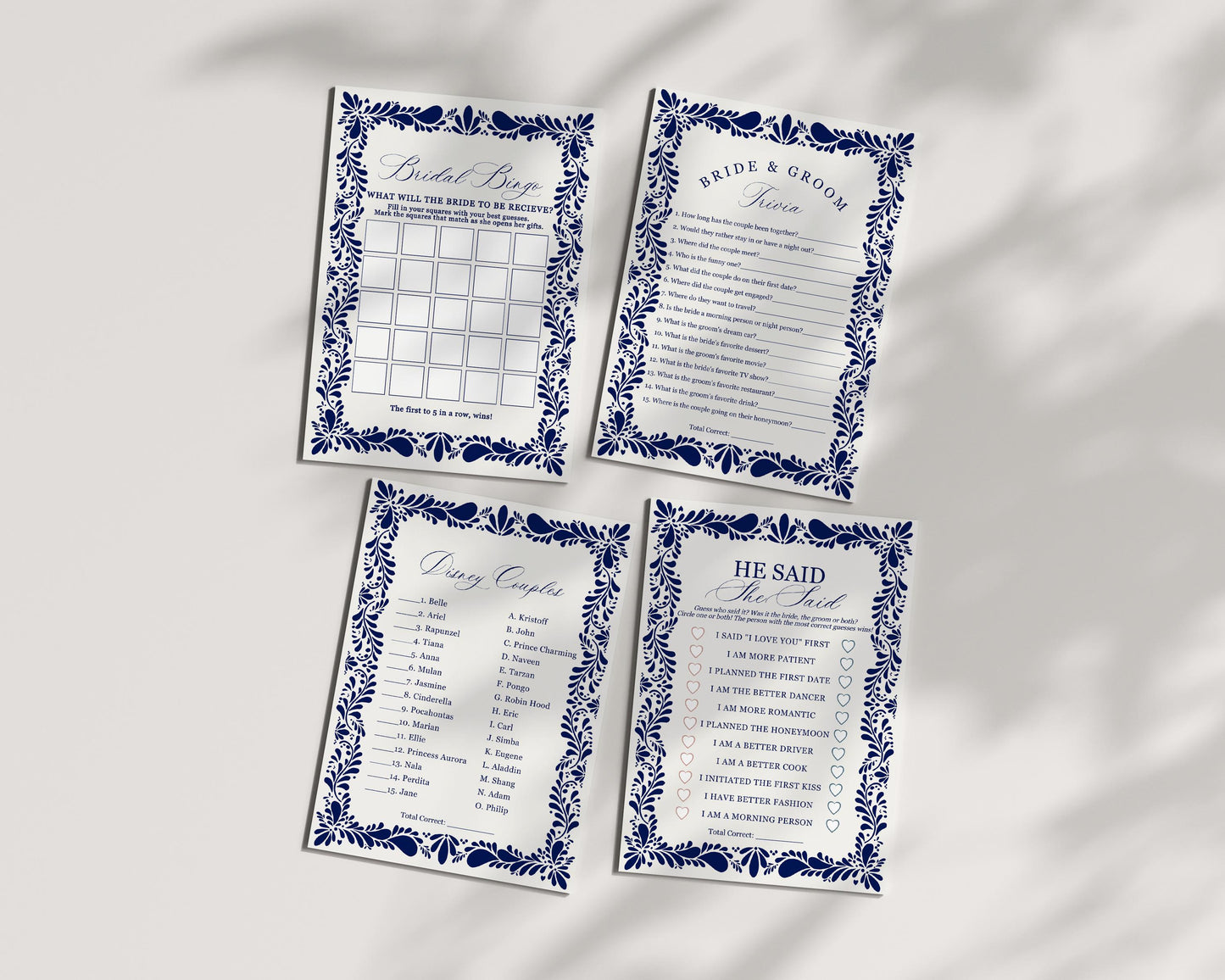 Blue Talavera Bridal Shower Games Set Printable Template, Spanish Tile Mexican Couples Shower Fiesta, Papel Picado Bridal Brunch WP1018