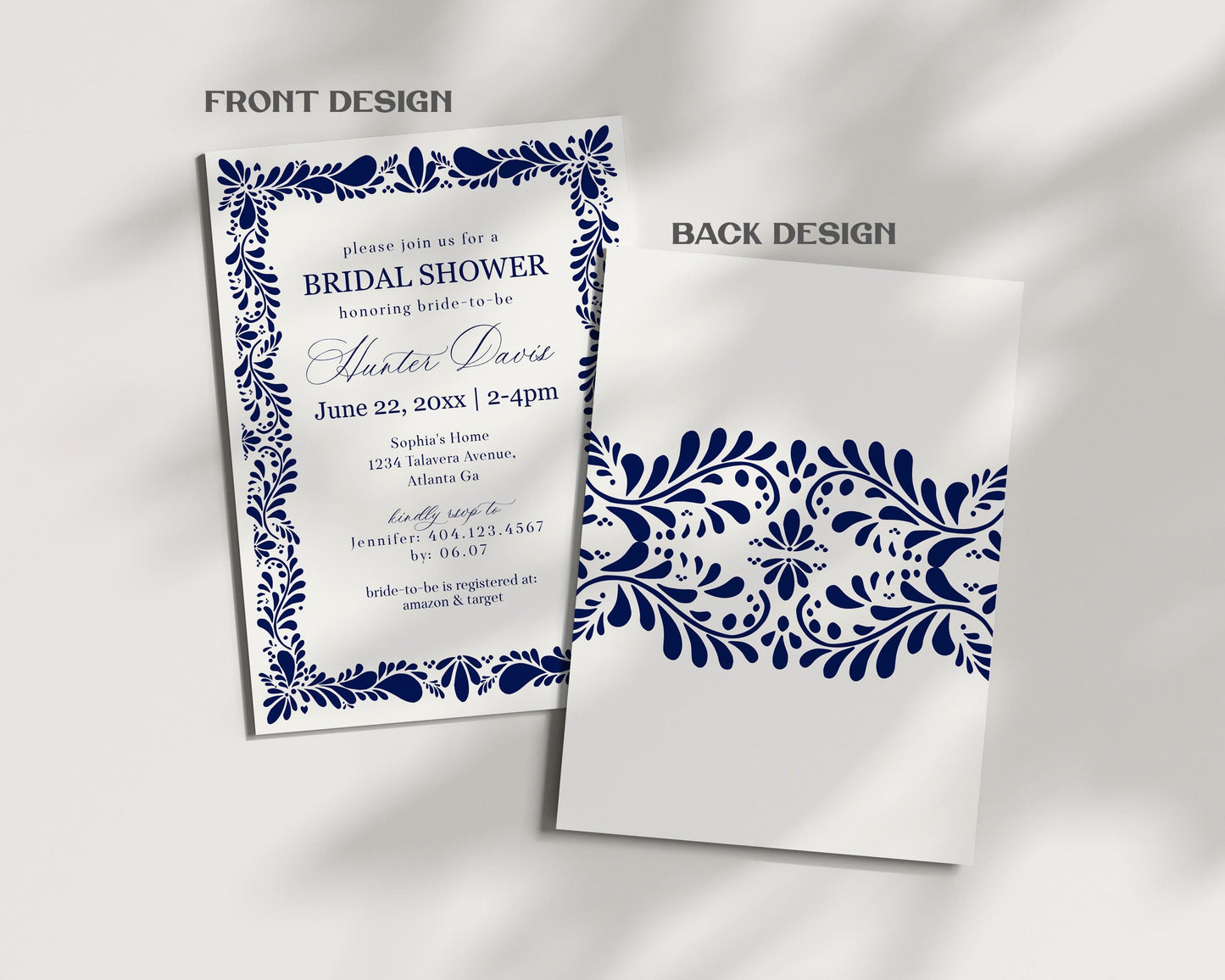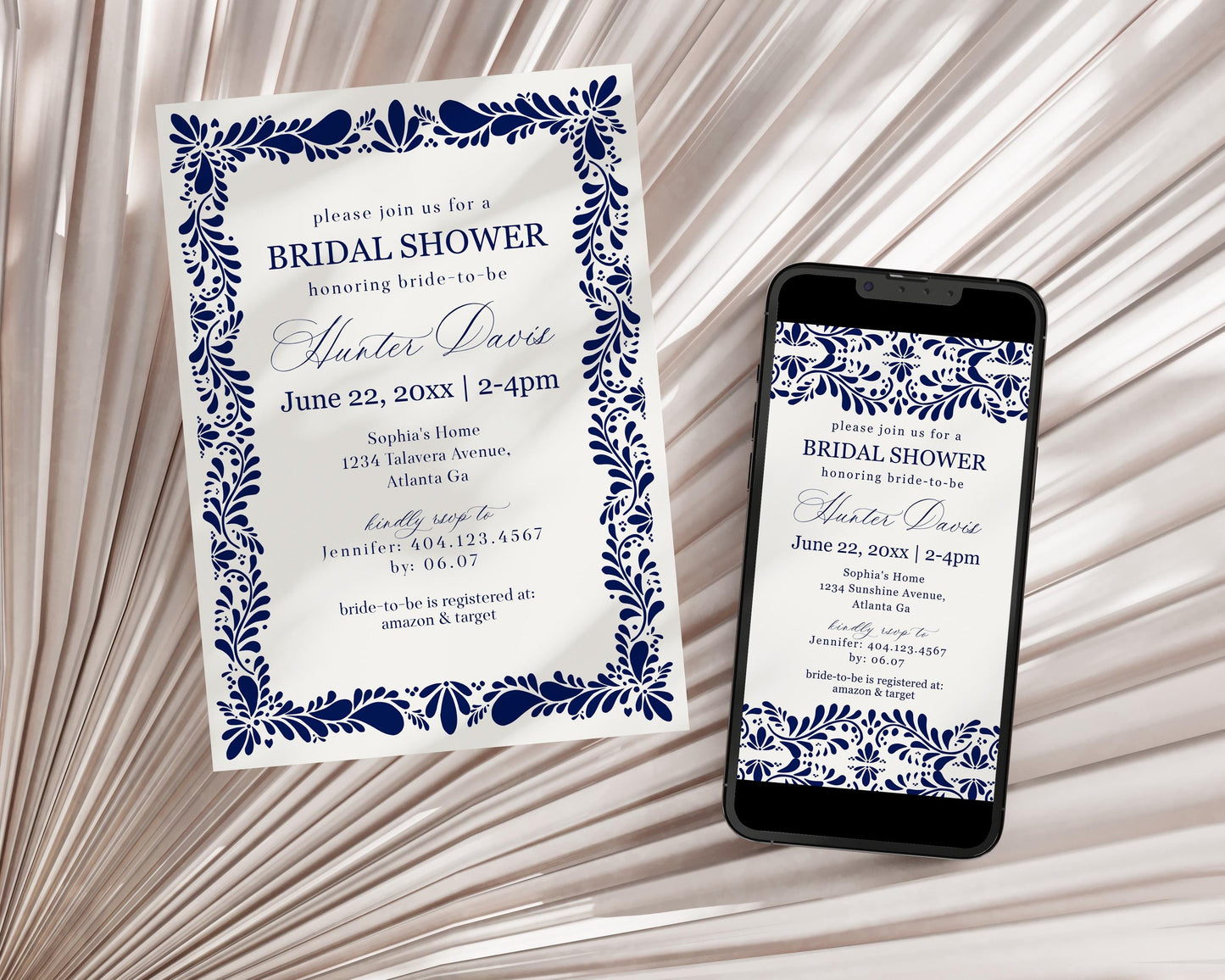 Blue Talavera Wedding Invite Printable Template, Spanish Mexican Couples Shower Fiesta, Rose Papel Picado Bridal Brunch WP1018