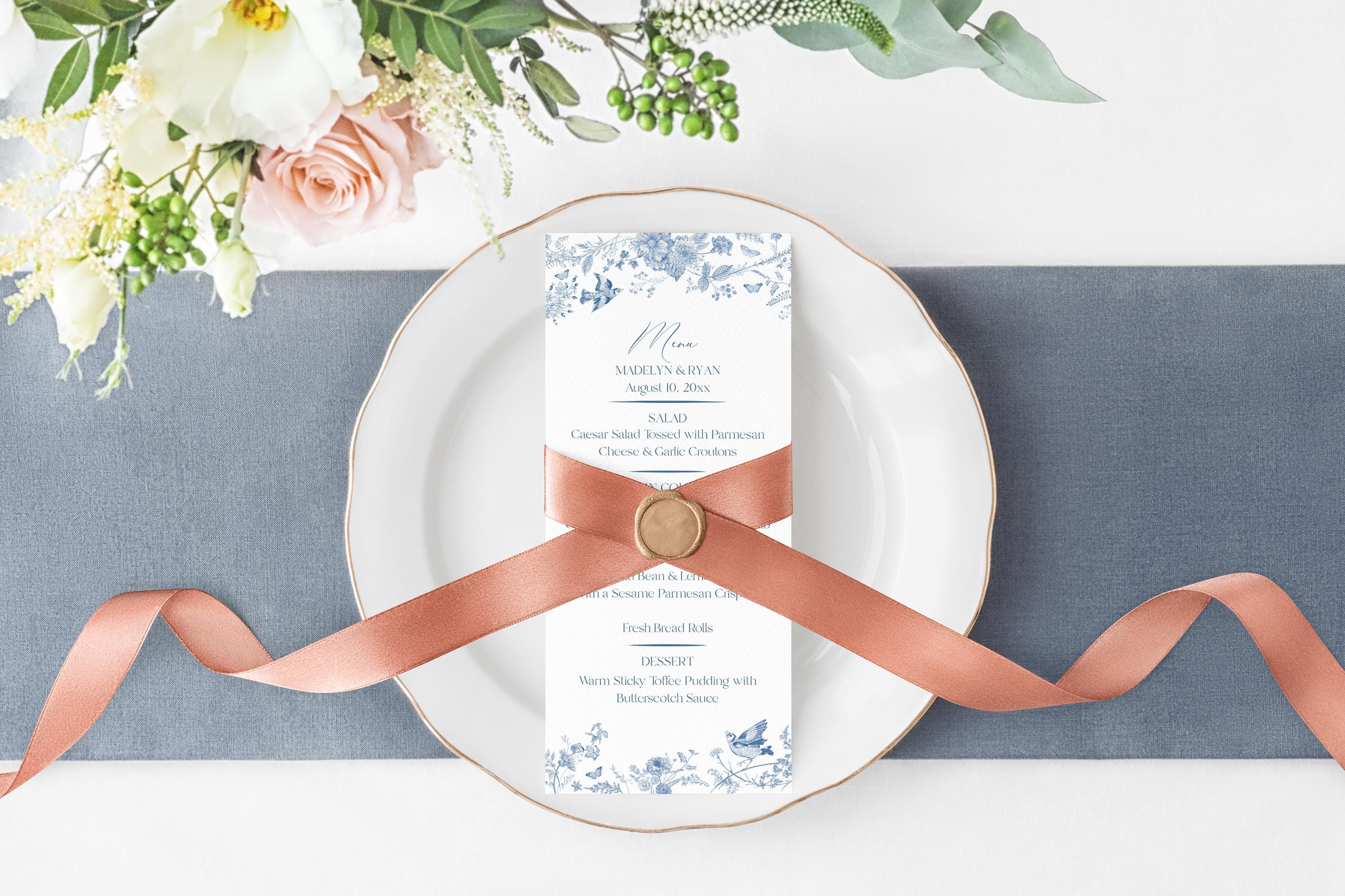 Blue Toile De Jouy Printable Wedding Menu Template