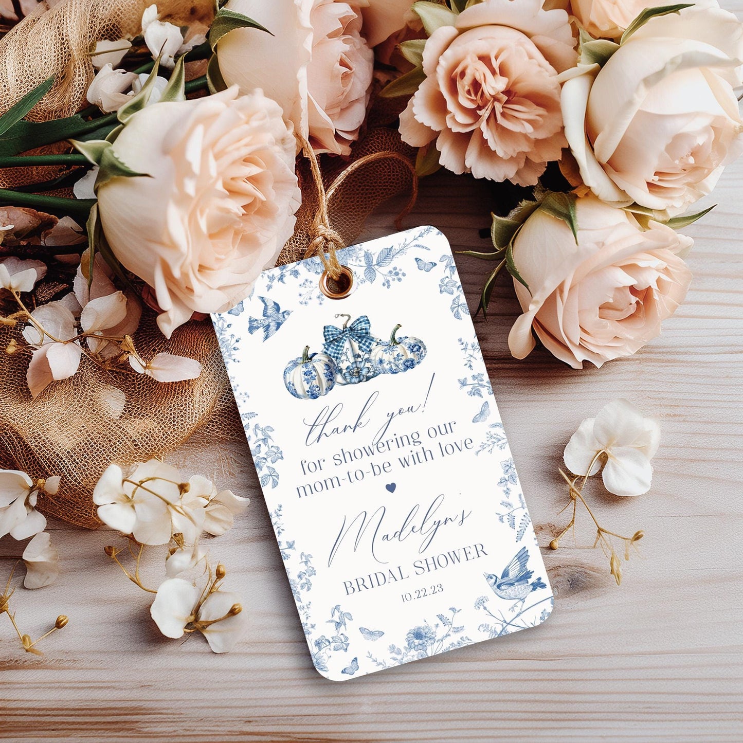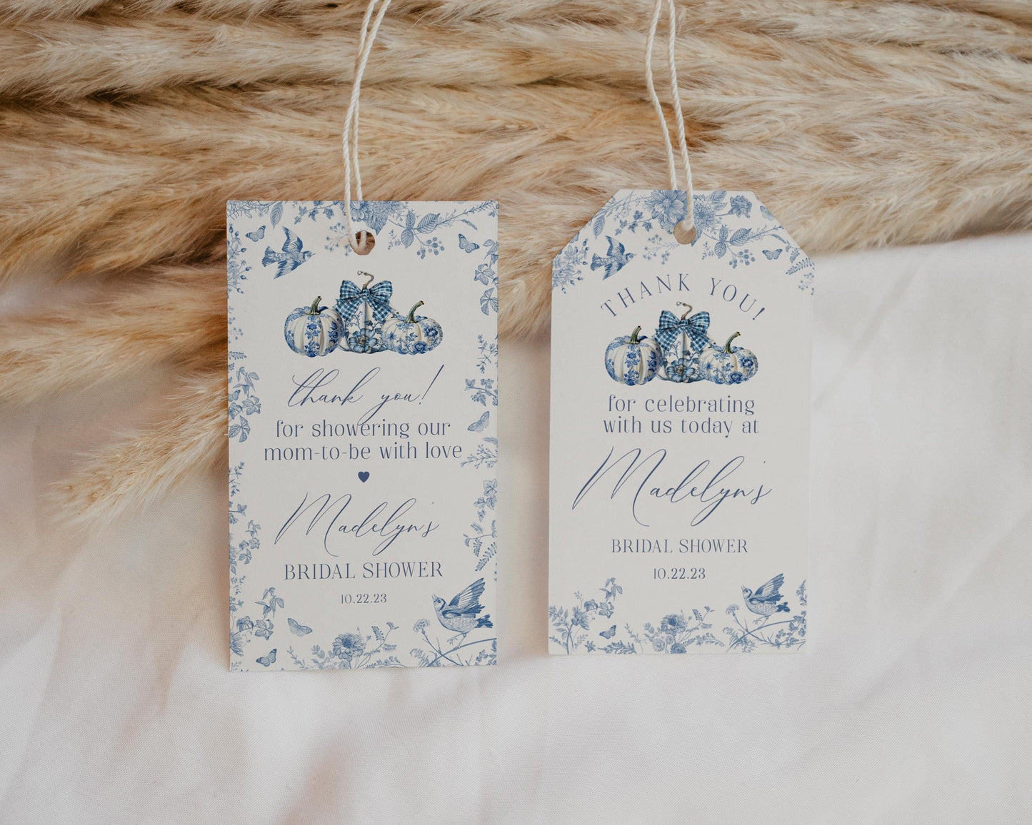 Blue Toile De Jouy Pumpkin Bridal Shower Favor Tags Printable Template