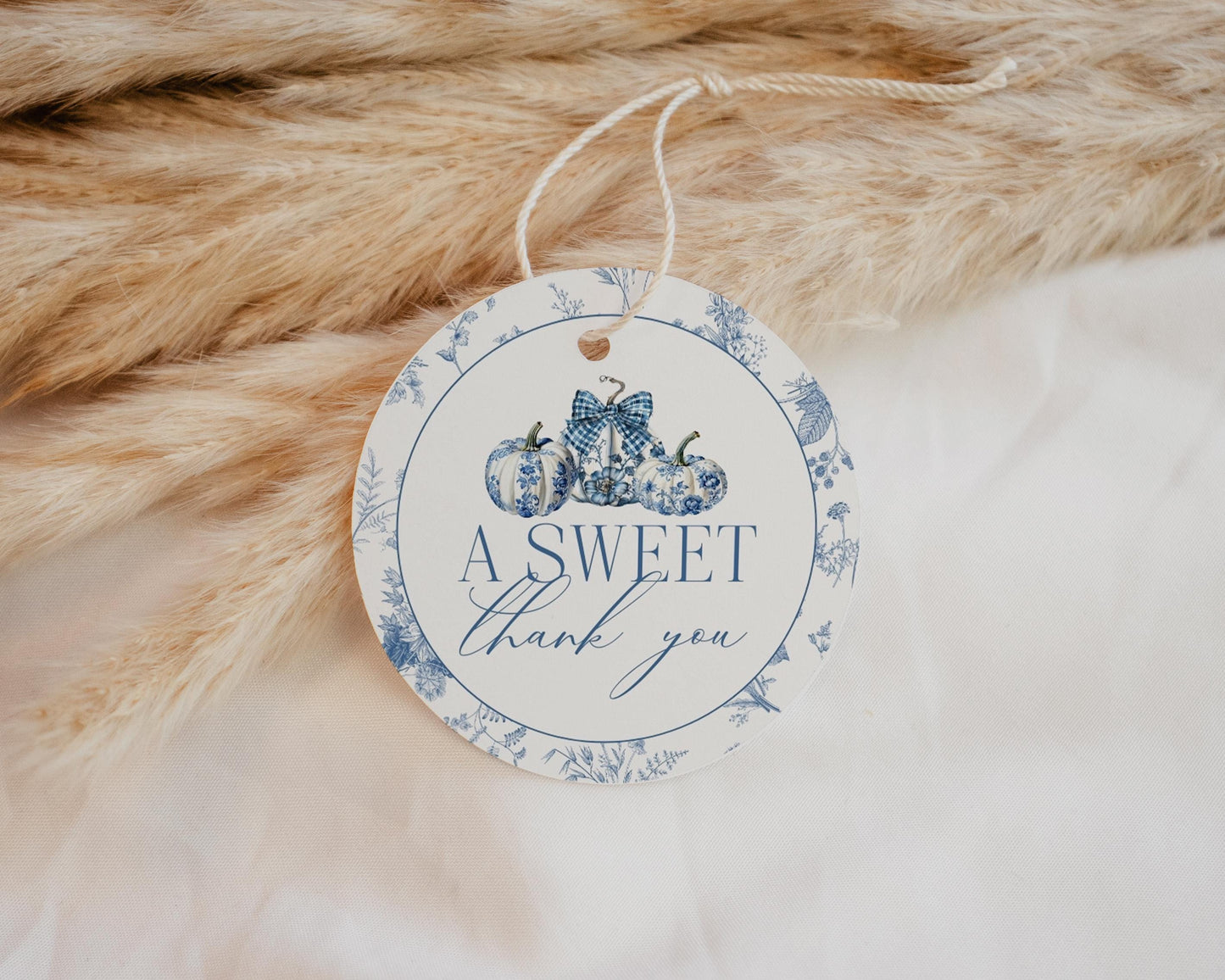 Blue Toile De Jouy Pumpkin Baby Shower Favor Tags Printable Template