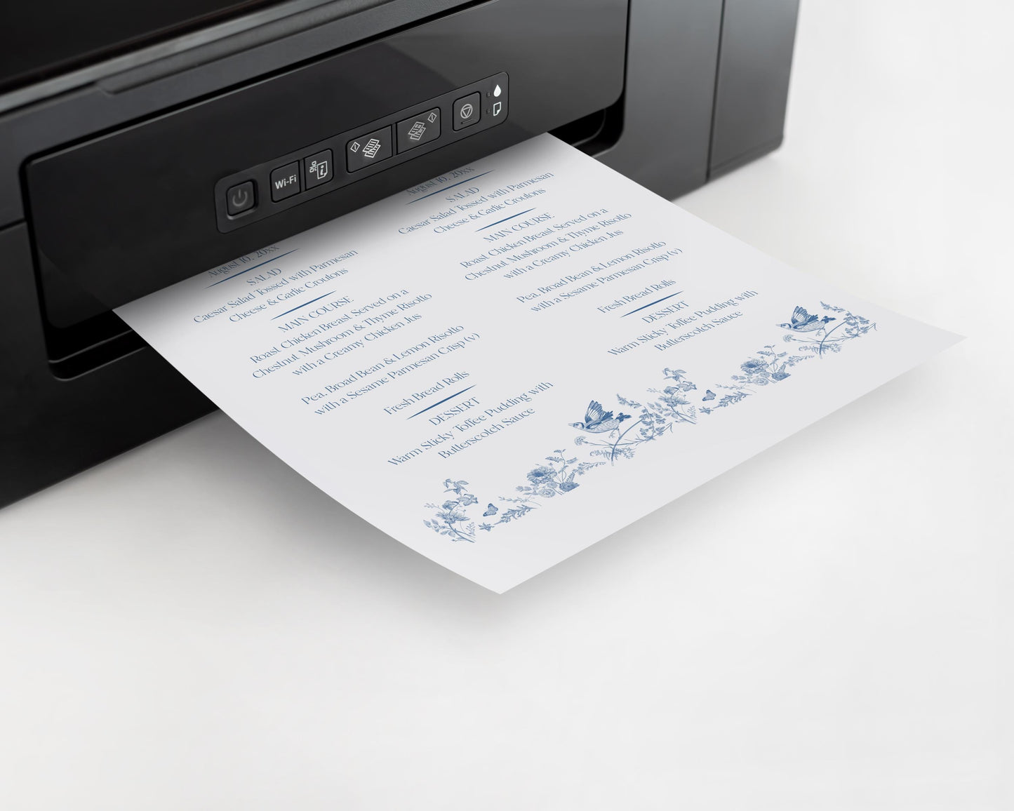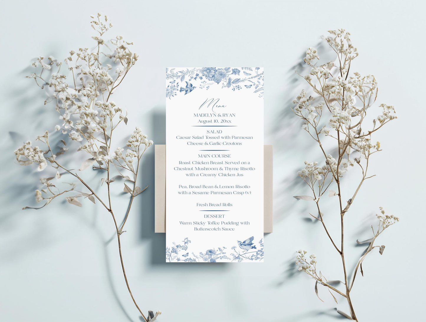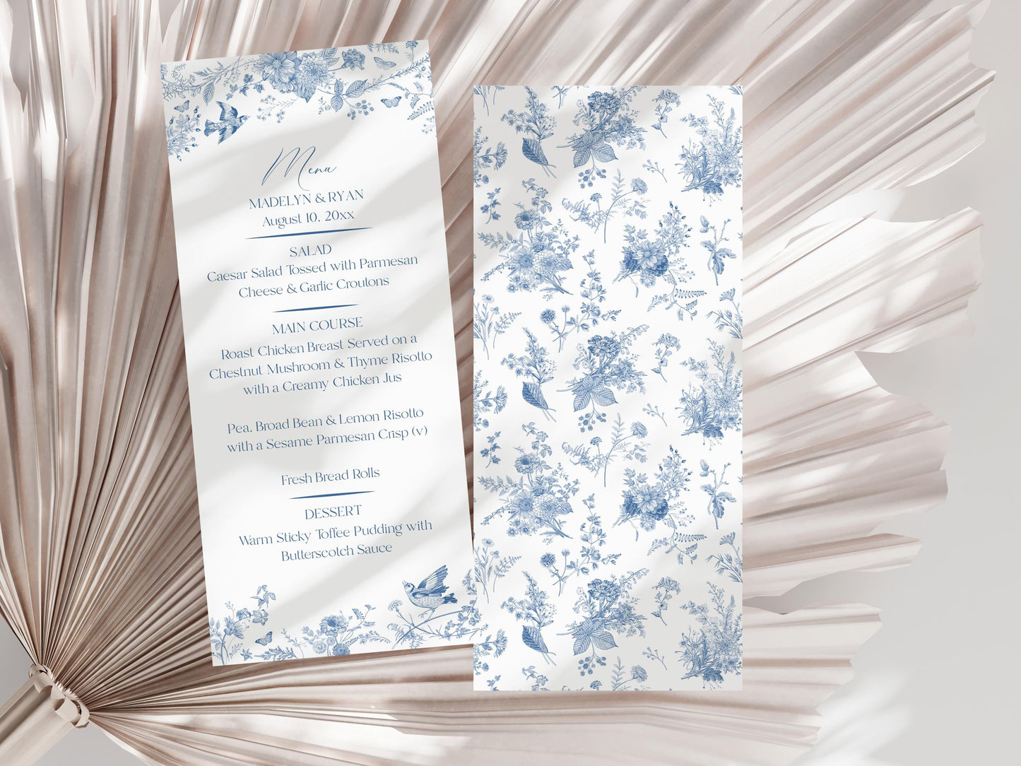 Blue Toile De Jouy Printable Wedding Menu Template, Something Blue Before I Do French Chinoiserie Spring Wildflower Bridal Brunch wp1004