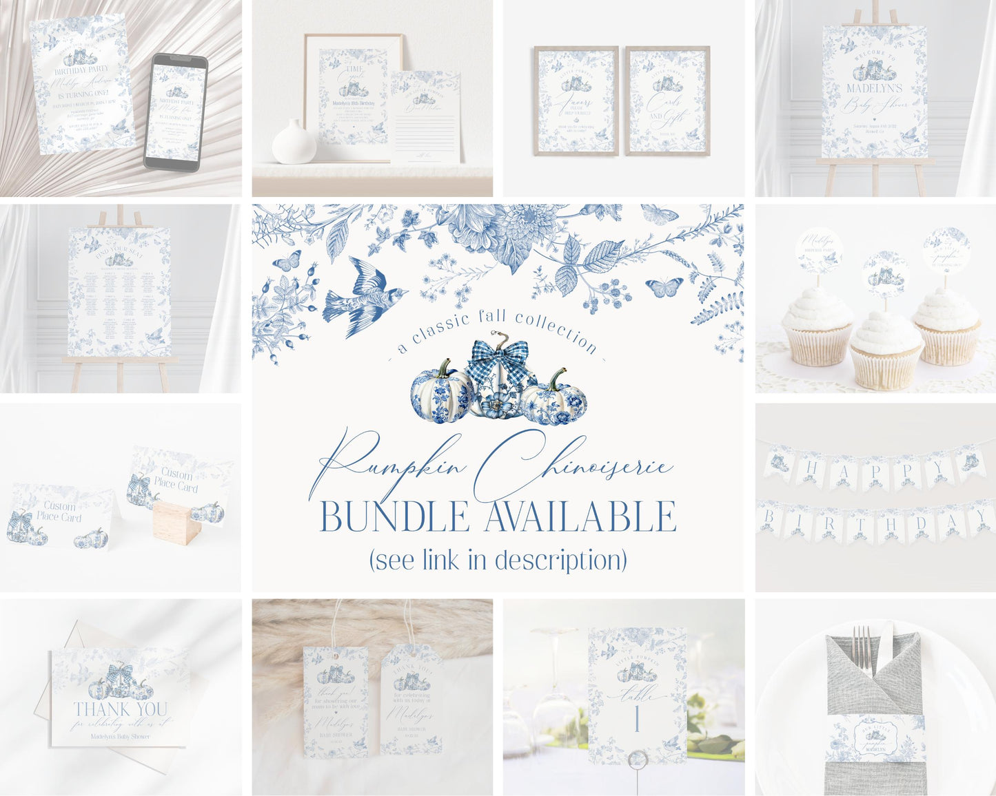 Blue Toile De Jouy Pumpkin Birthday Bundle Printable Template, Blue Chinoiserie Birthday Party for September October Bday Autumn French