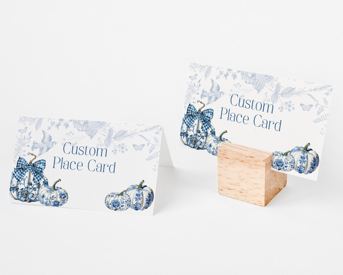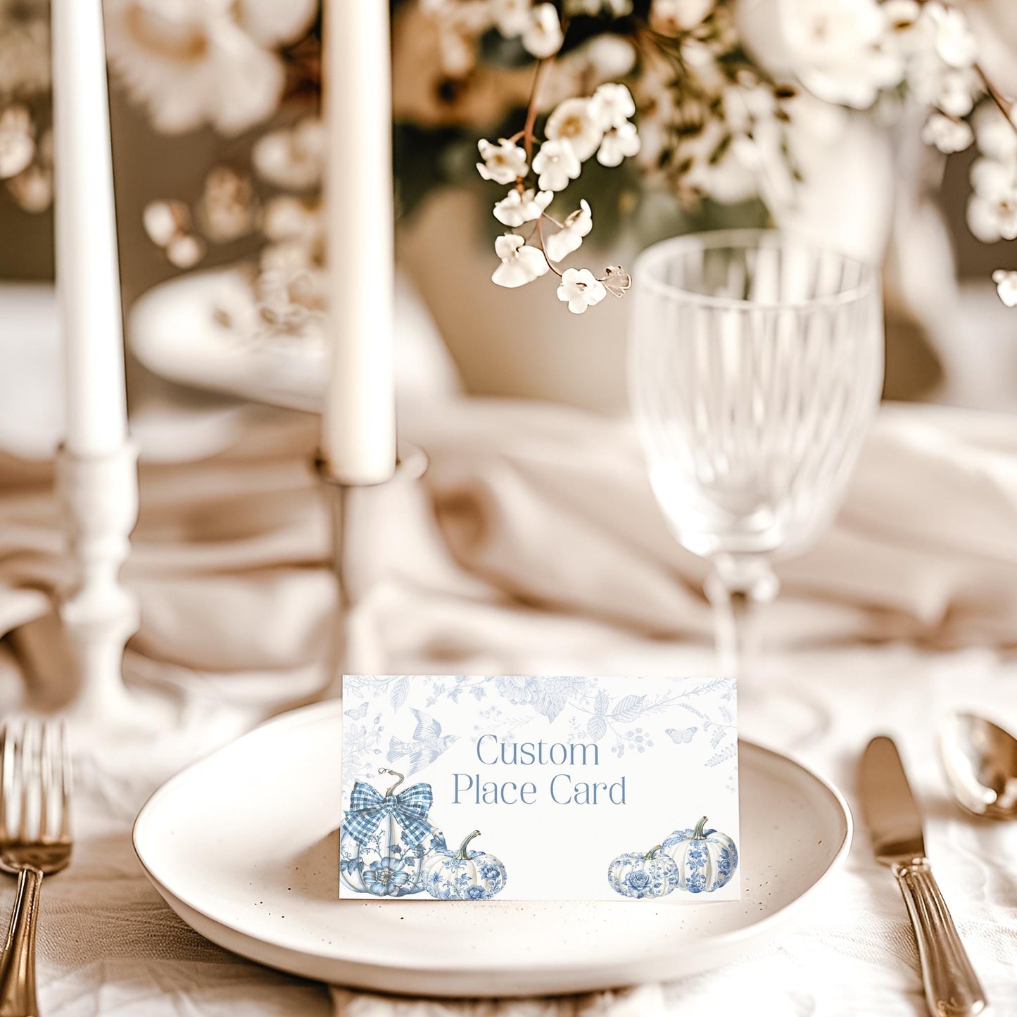 Blue Toile De Jouy Pumpkin Place Cards for Baby Shower or Birthday Printable Template, Fall Chinoiserie Birthday for September October Bday