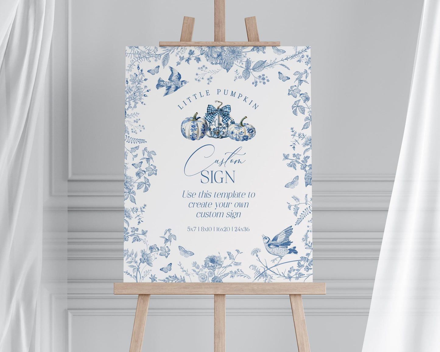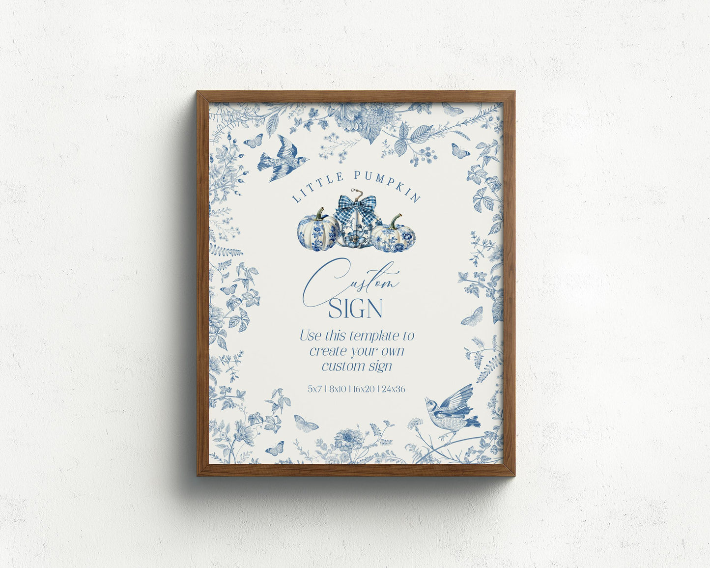 Blue Toile Pumpkin Custom Sign Printable Party Decor for Baby or Bridal Shower, Fall chinoiserie decor September October French Theme