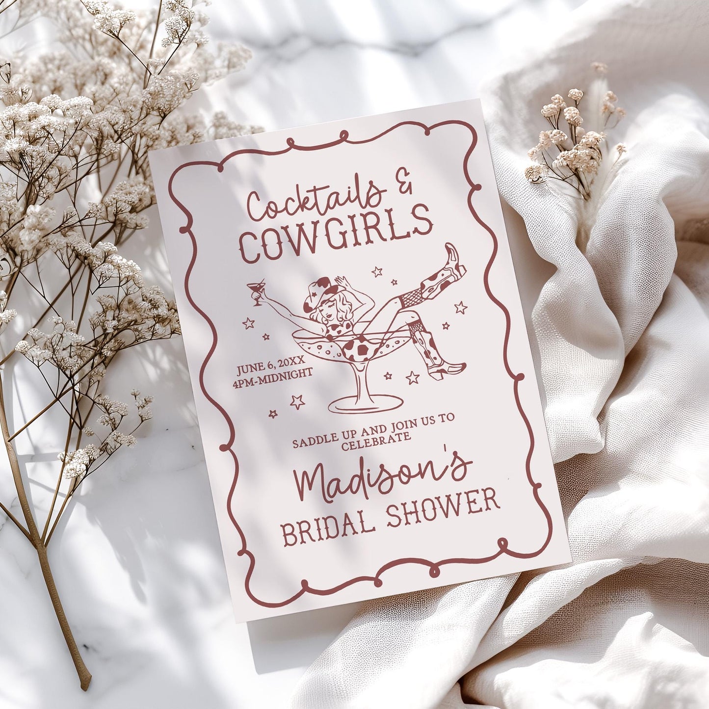 Burgundy Cocktails and Cowgirls Bridal Shower Invitation Template, Western Brunch With Bride, Boots Bubbly Last Rodeo Nash Bash WP1042