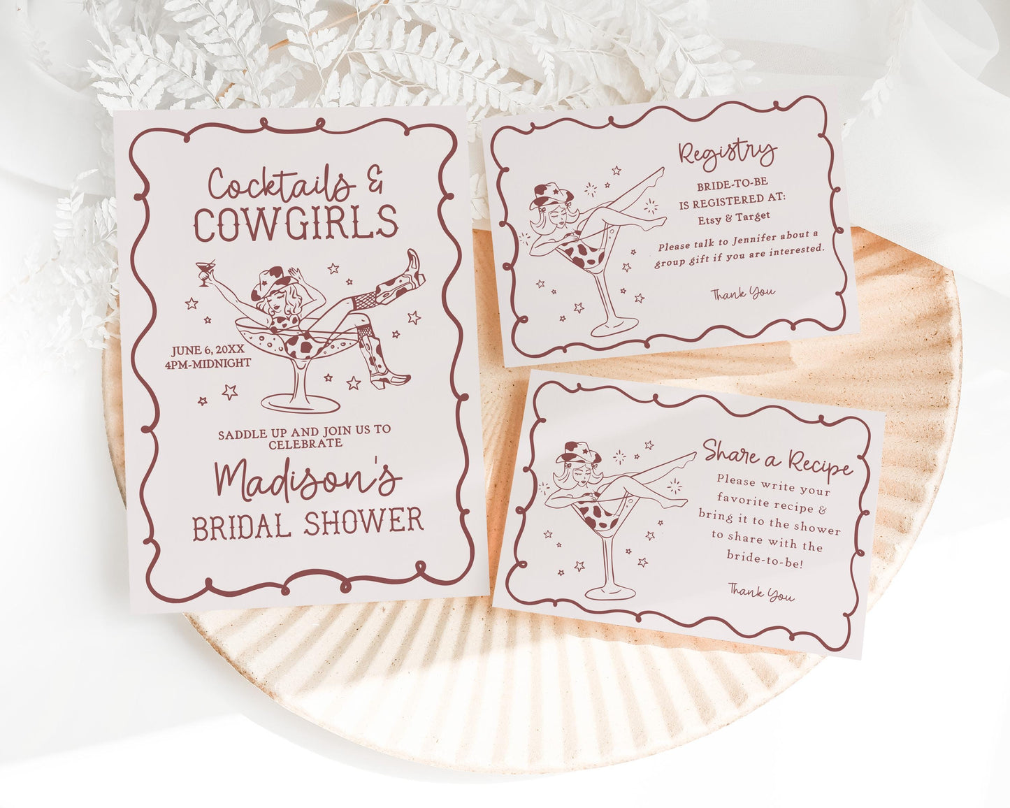 Get ready to celebrate your bride in true Nashville style with this Cocktails and Cowgirls Collection! Featuring a chic cowgirl lounging in a cocktail glass and neutral burgundy accents, it’s giving Nashville Girls Night vibes. Grab your boots and your besties because this is going to be a party to remember!
