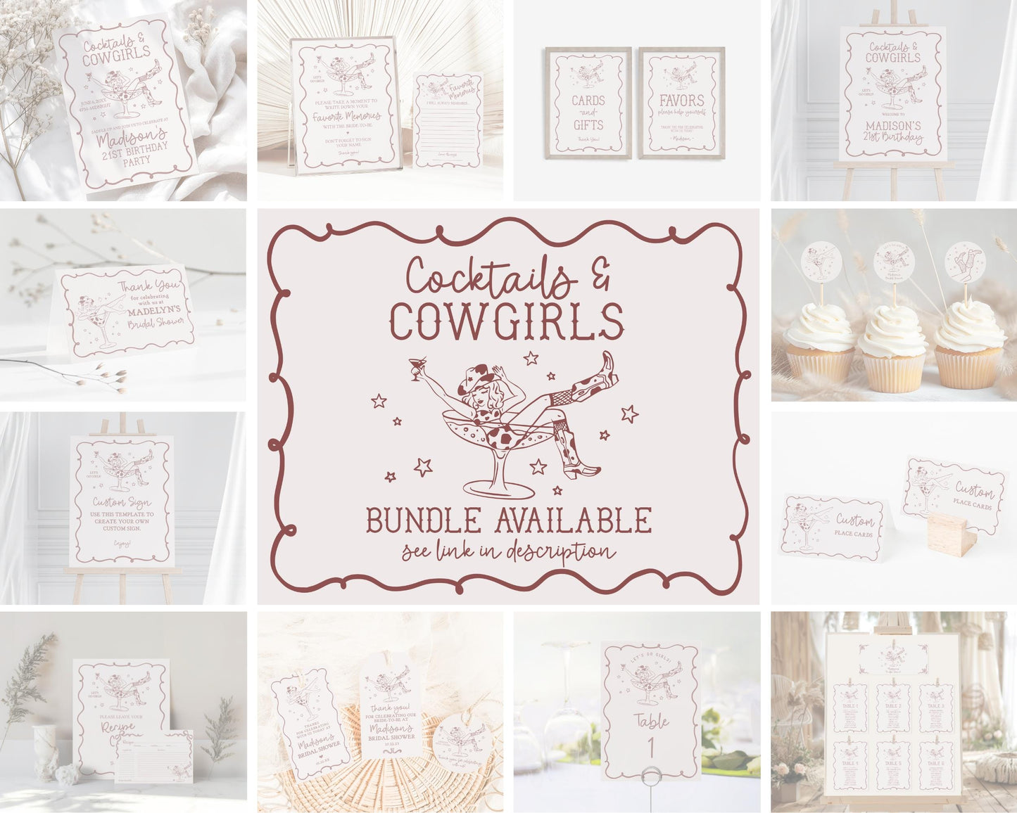 Burgundy Cocktails and Cowgirls Cards & Gifts, Favors Sign Template, Western Bridal Shower Nashville Birthday Last Rodeo Bachelorette WP1042
