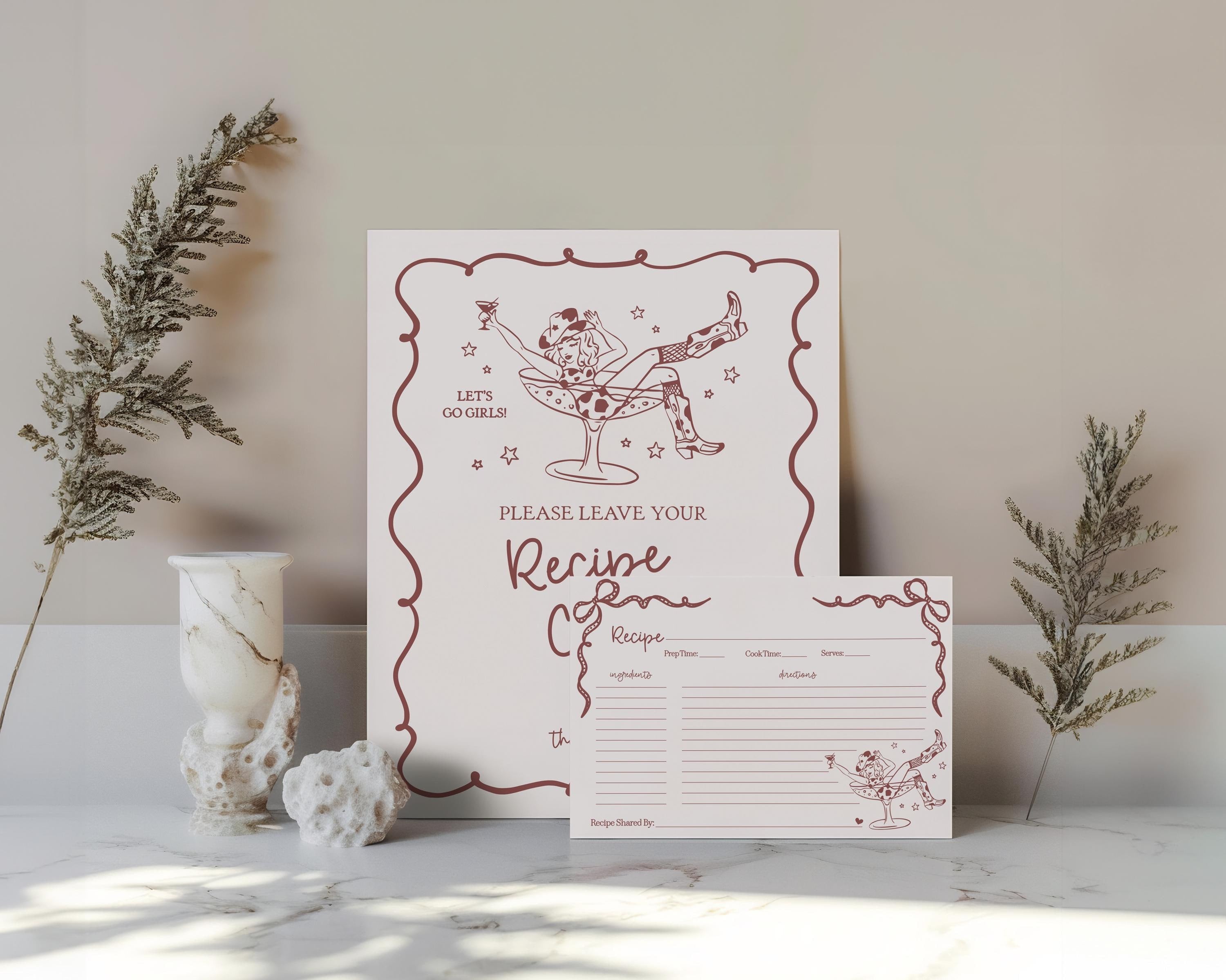 Burgundy Cocktails and Cowgirls Recipe Card Template, Western Theme Bridal Brunch With Bride, Boots and Bubbly Last Rodeo Nash Bash WP1042