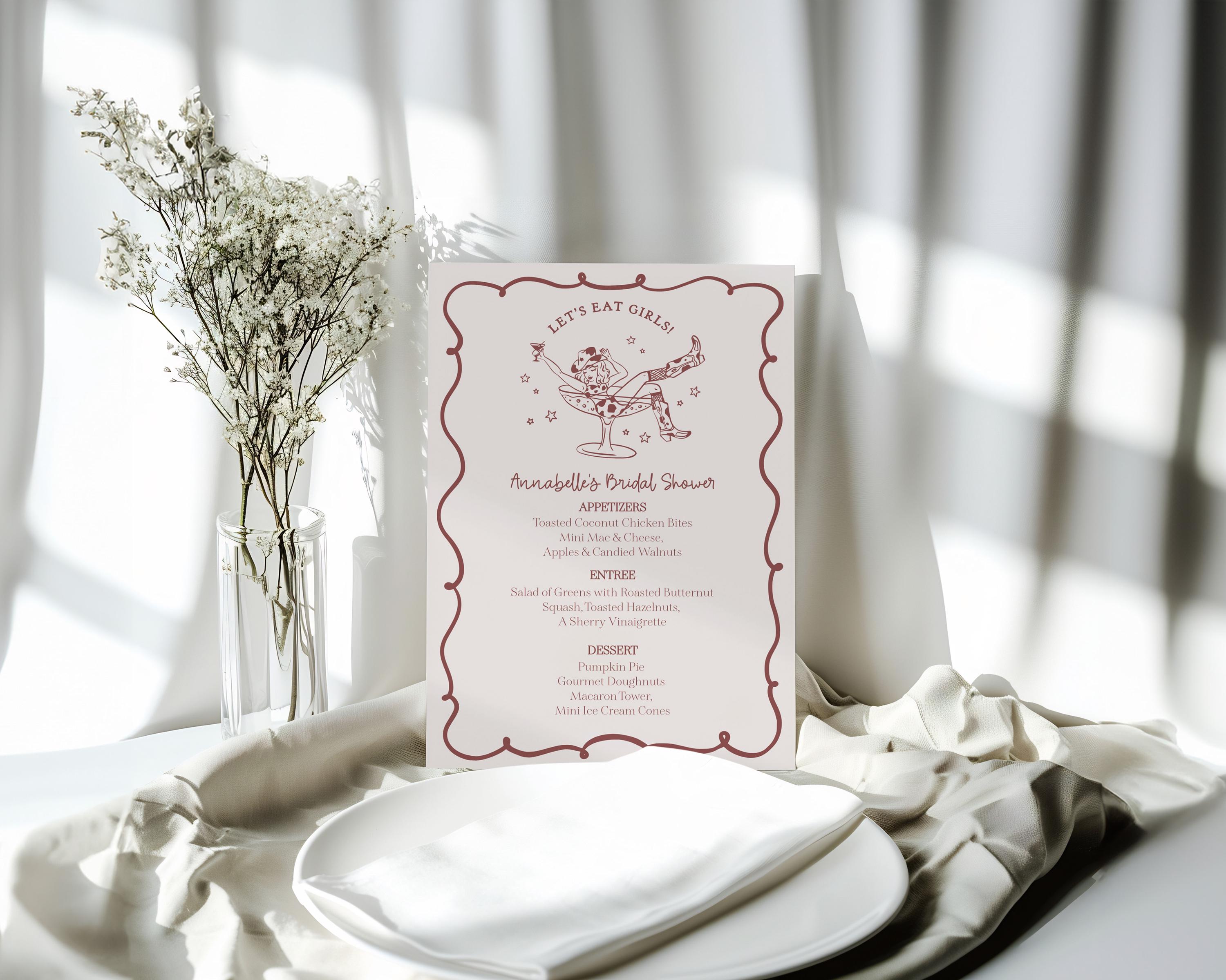 Burgundy Cocktails and Cowgirls Menu Template, Western Theme Bridal Shower, Nashville Birthday Party, Last Rodeo Bachelorette Party WP1042