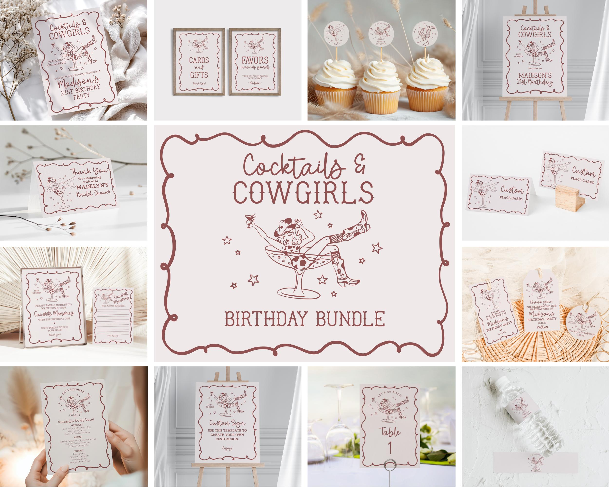 Burgundy Cocktails and Cowgirls Birthday Bundle Template