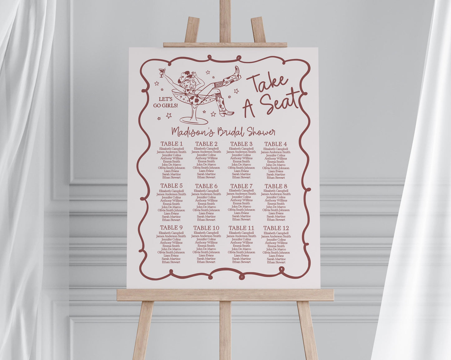 Burgundy Cocktails and Cowgirls Seating Chart Template, Western Theme Bridal Shower, Nashville Birthday Party Last Rodeo Bachelorette WP1042