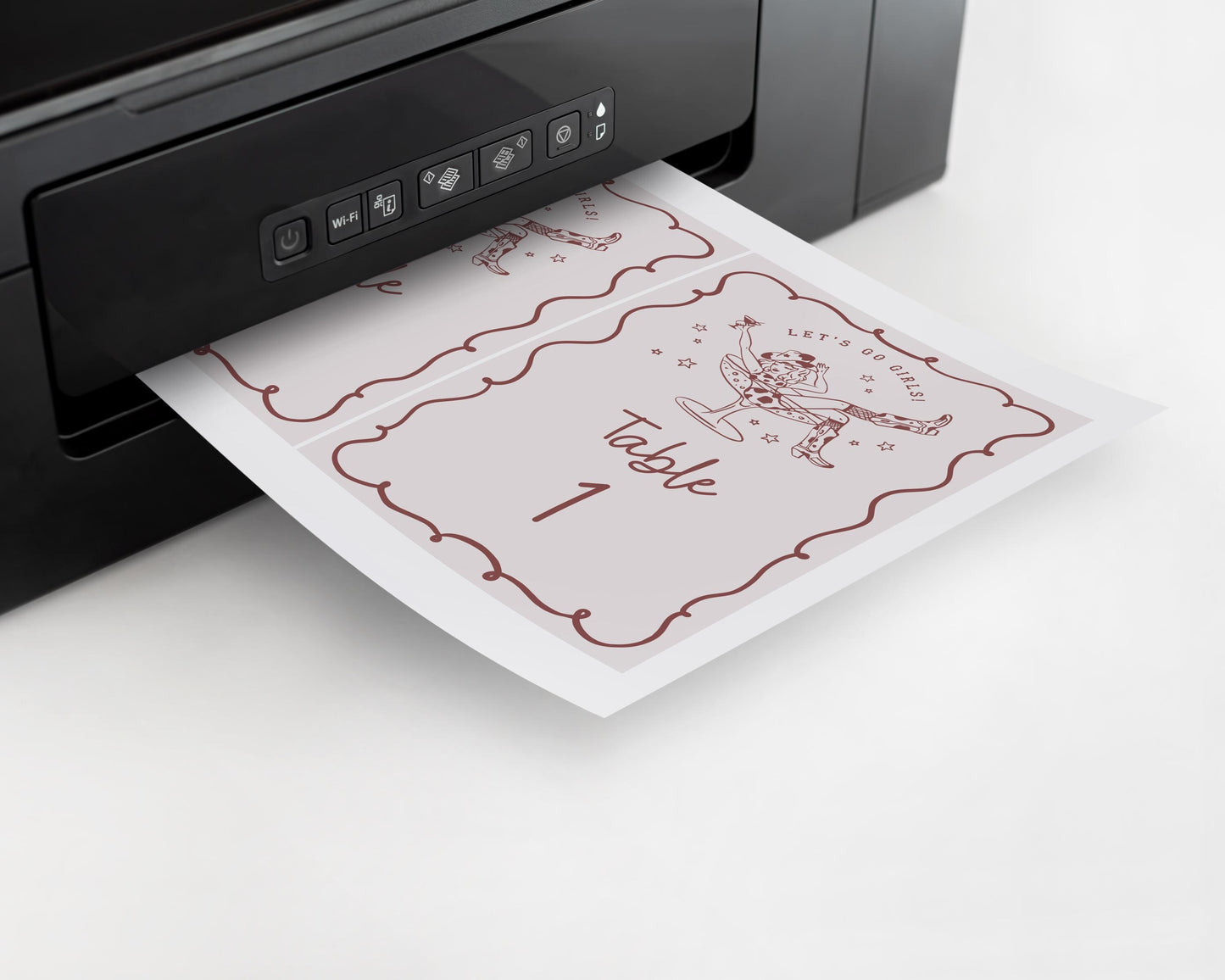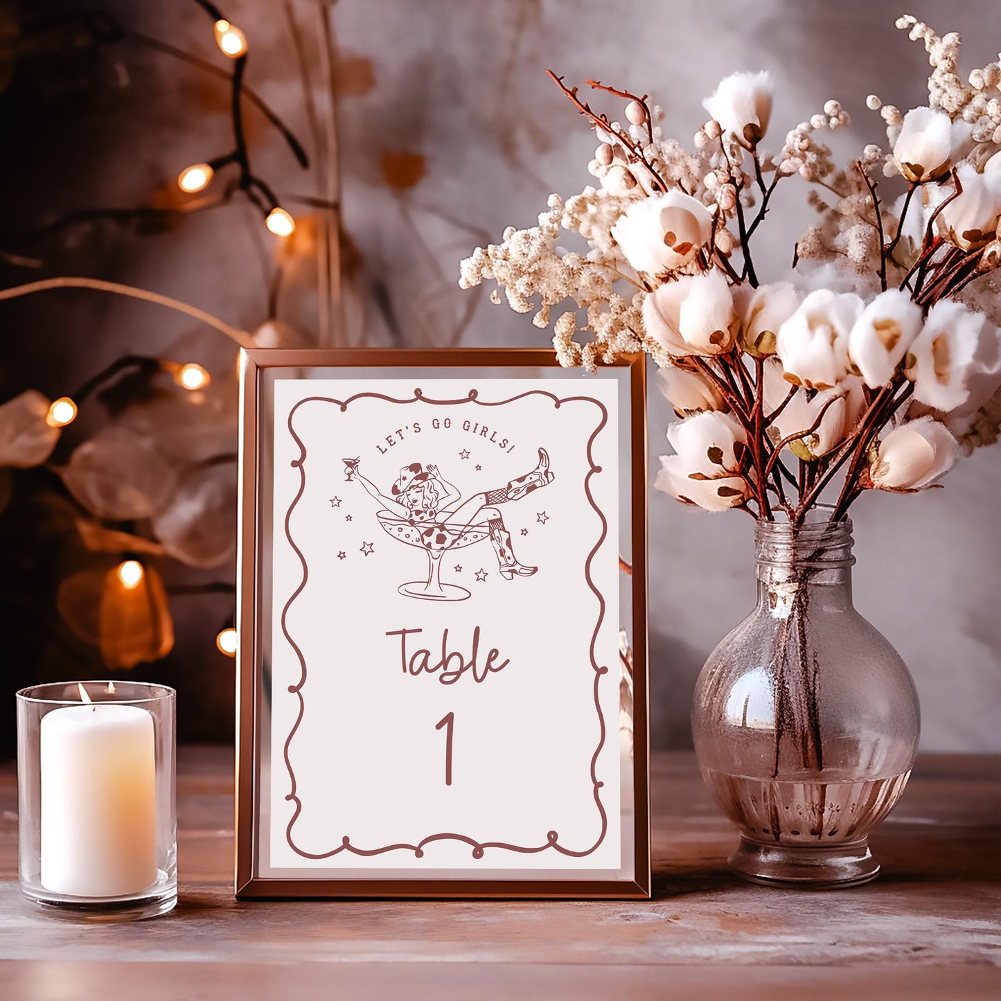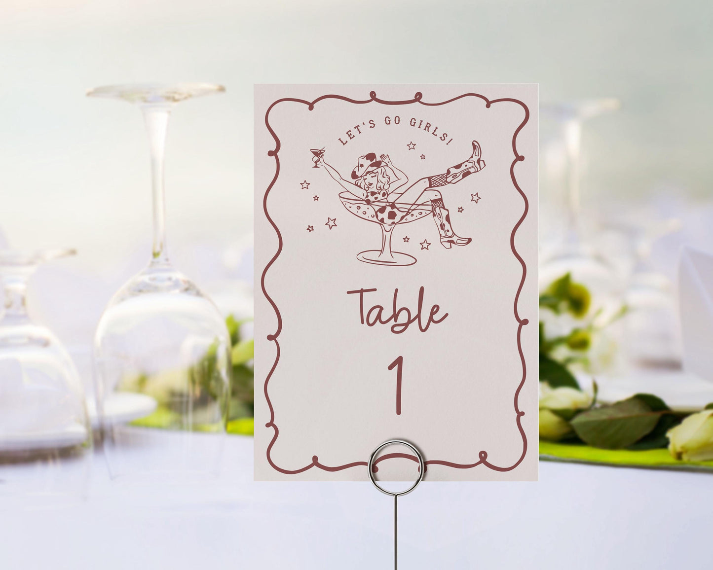 Burgundy Cocktails and Cowgirls Table Number Cards Template, Western Bridal Shower Nashville Birthday Party Last Rodeo Bachelorette WP1042
