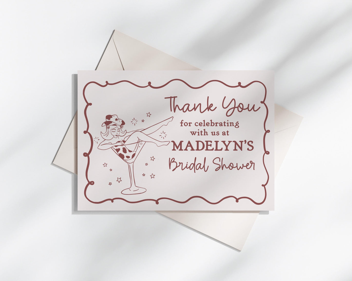 Burgundy Cocktails and Cowgirls Thank You Card Template, Western Bridal Shower Nashville Birthday Party Last Rodeo Bachelorette Party WP1042