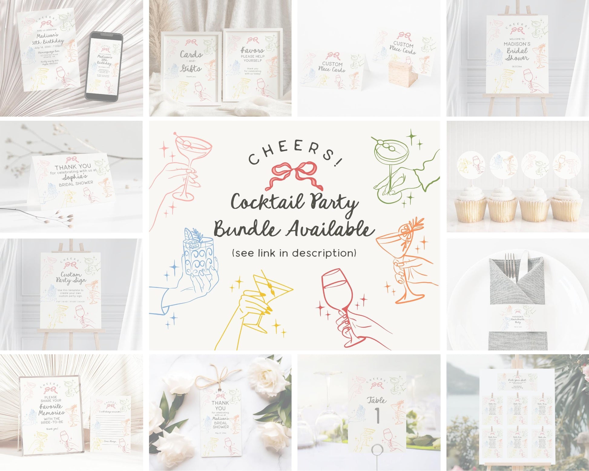 Cheers Colorful Cocktail Party Birthday Bundle Template
