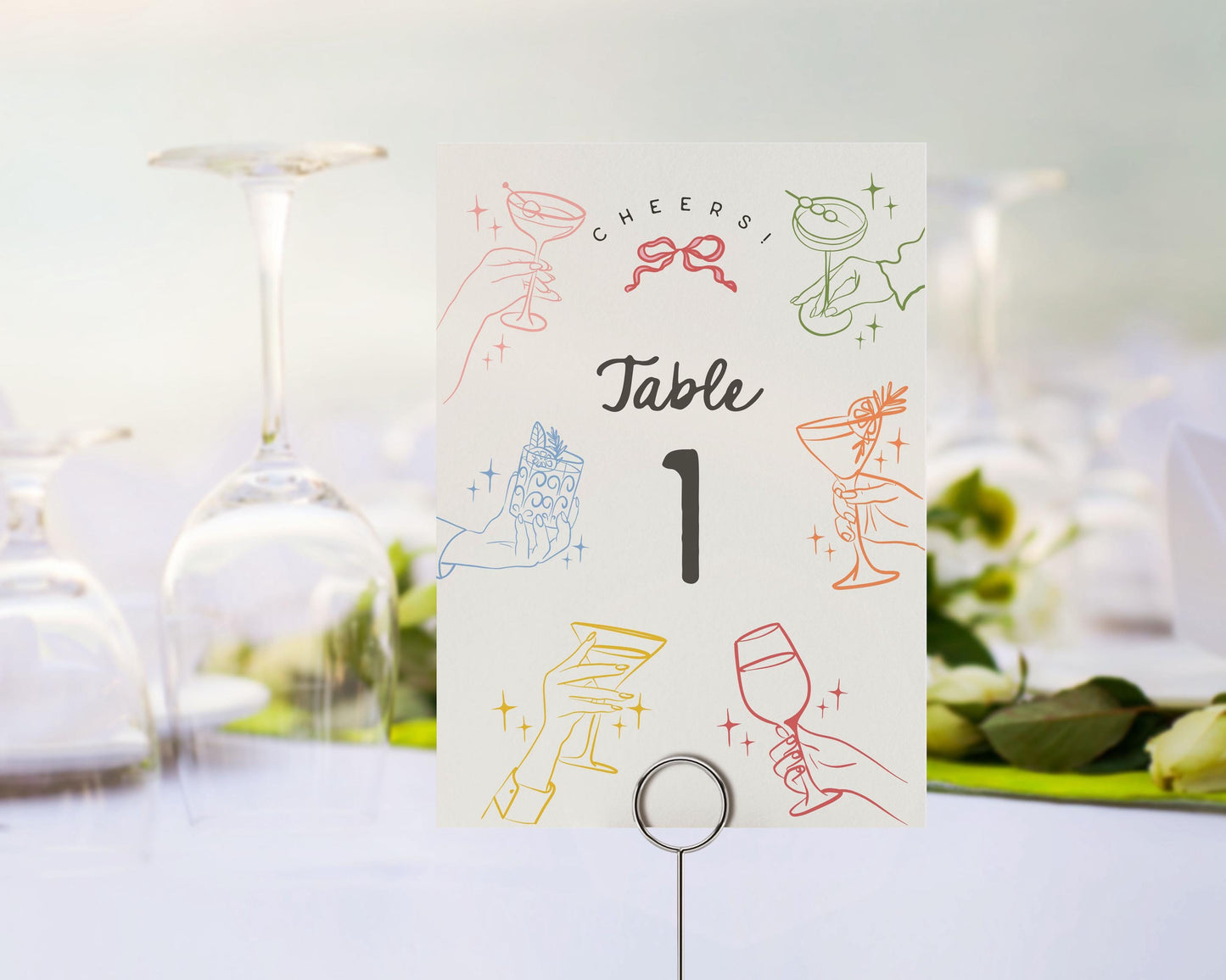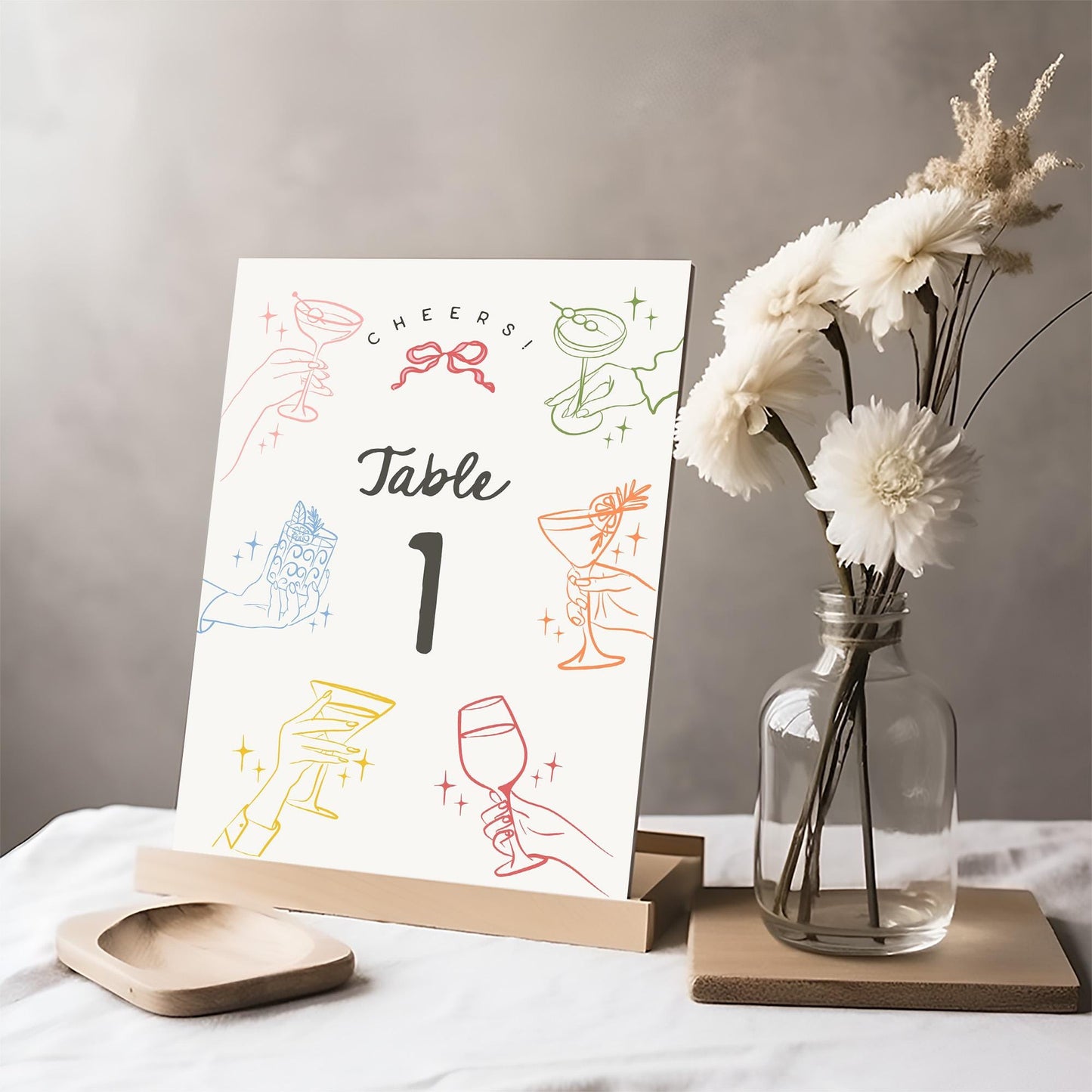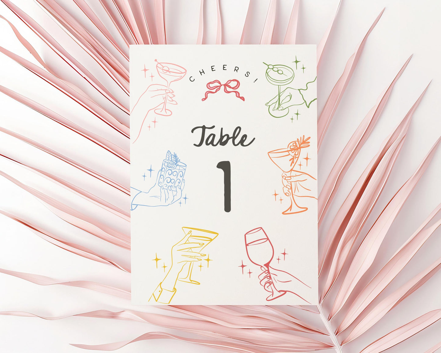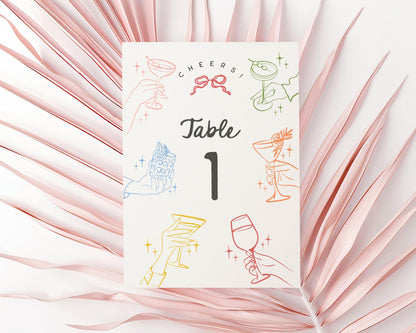 Cheers Colorful Cocktail Party Table Number Template, Retro Cocktail Hour Birthday Party, Hand Drawn Cocktails for 60s Bridal Shower WP1054