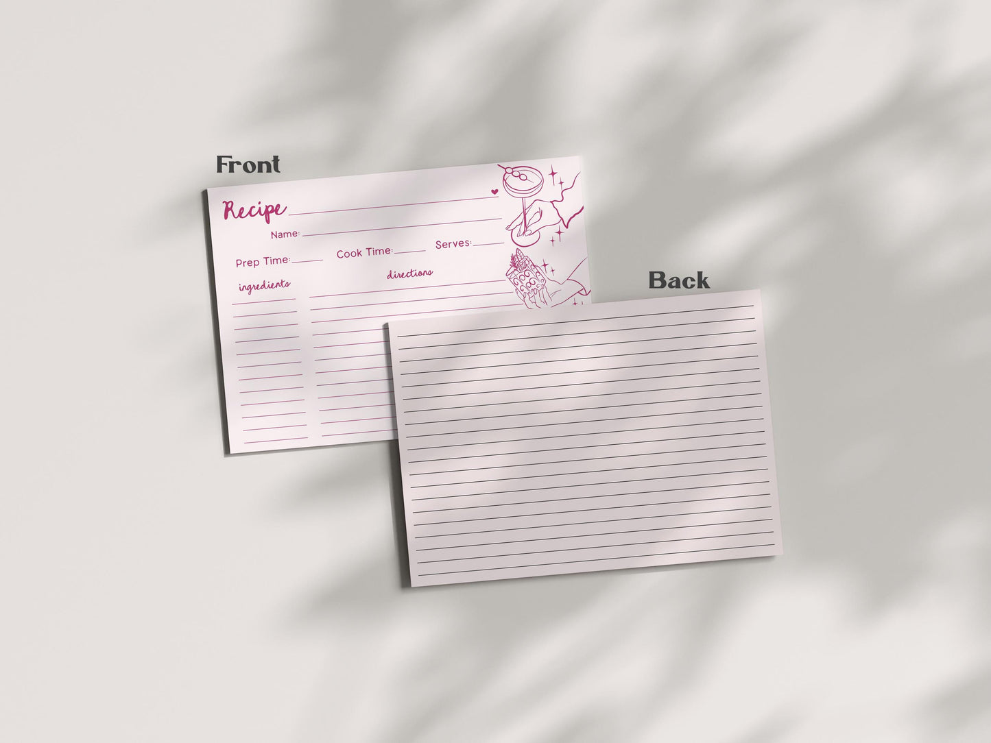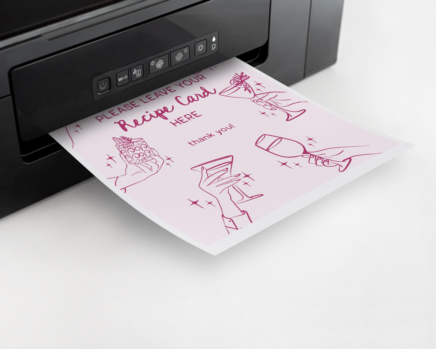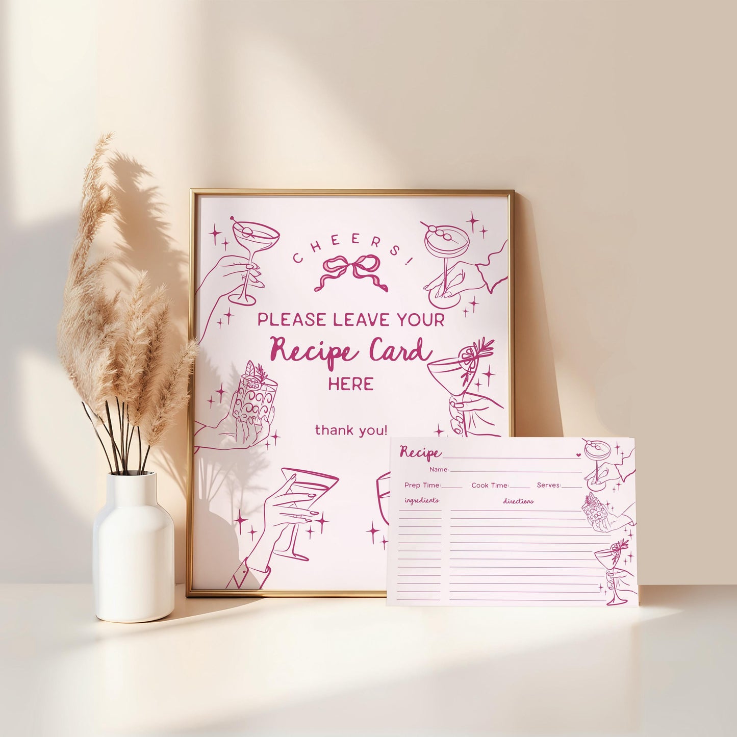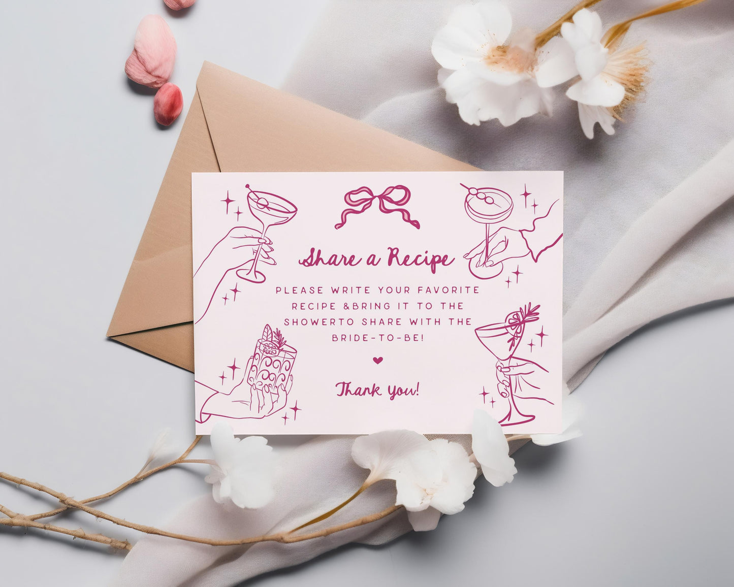 Cheers Pink Cocktail Party Recipe Card Template, Retro Cocktail Bridal Shower, Hand Drawn Cocktails Stock the Bar 60s Engagement WP1055