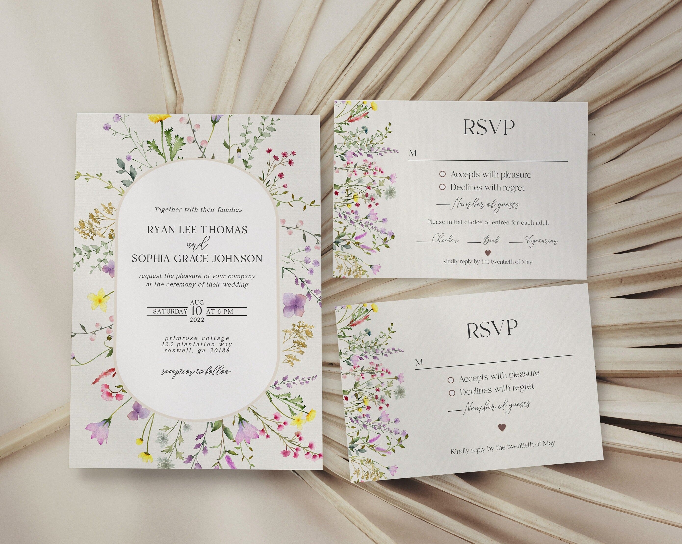 Delicate Wildflower 3 Piece Wedding Invitation Template Set, floral wedding invite set, spring summer boho wedding, simple floral wedding