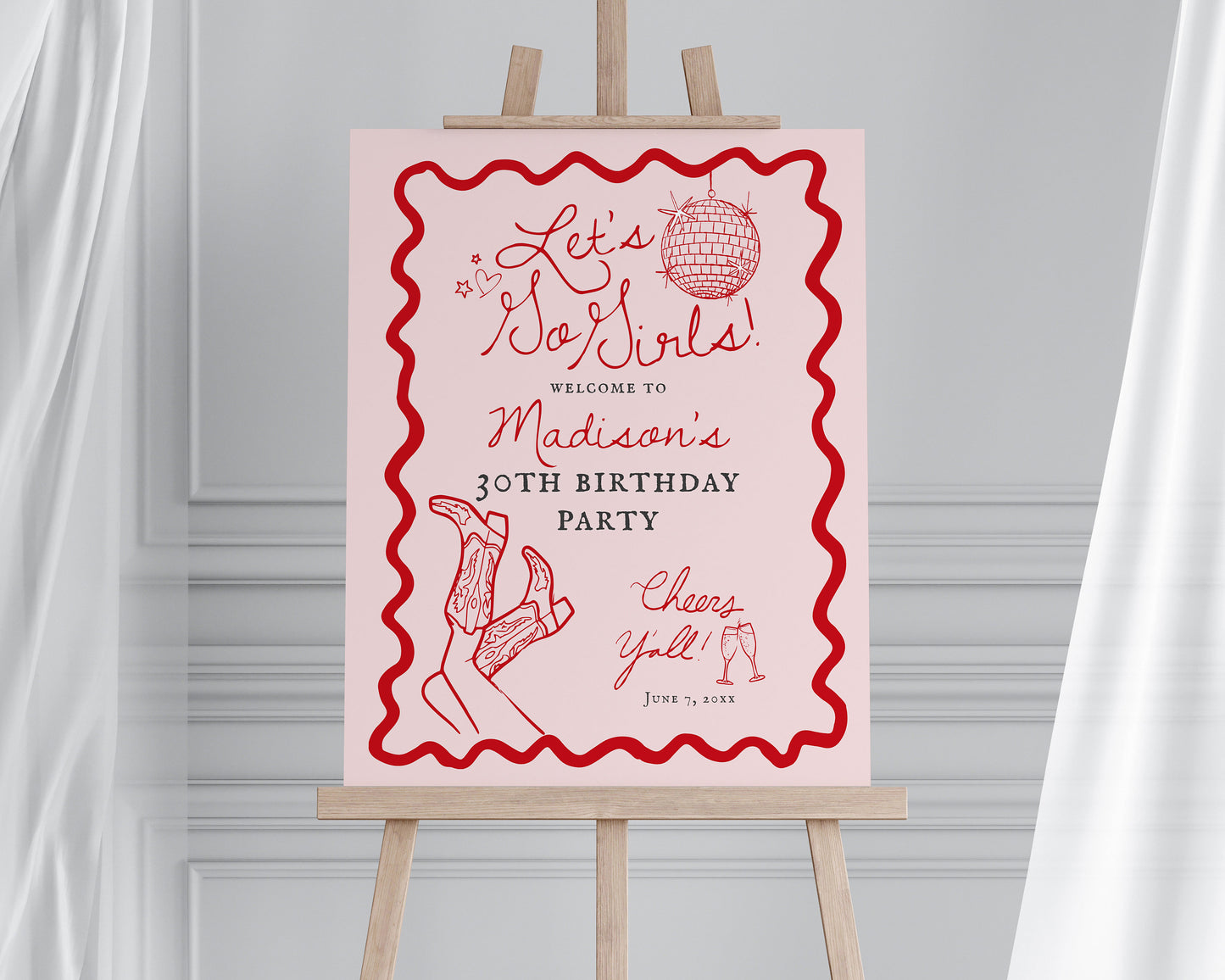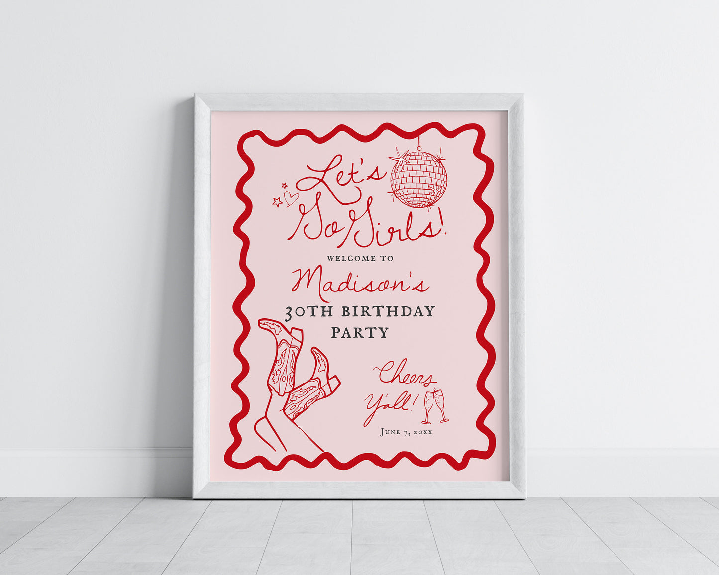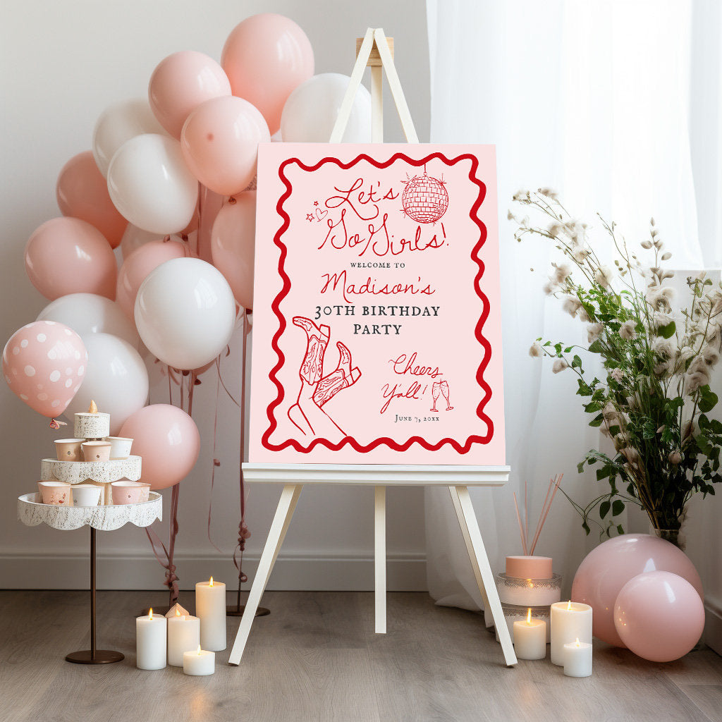 Let’s Go Girls! Saddle up for a disco cowgirl birthday bash with our vibrant Red and Pink rodeo theme party decor! Get ready to two-step the night away with this whimsical blend of disco and rodeo vibes inspired by the city of Nashville Tennessee. These hand-drawn decorations add a unique touch to your celebration, ensuring a night filled with laughter and unforgettable memories.