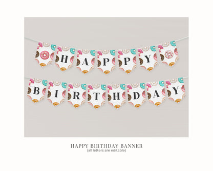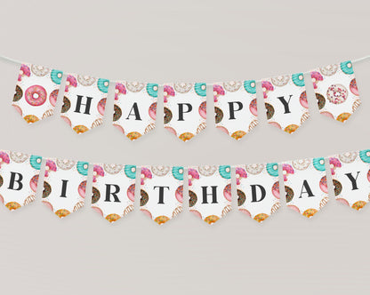 Donut Sprinkles Happy Birthday Banner Printable Template, Sprinkled Donut Birthday Part for Girl, Sweet Celebration Two Sweet One Birthday