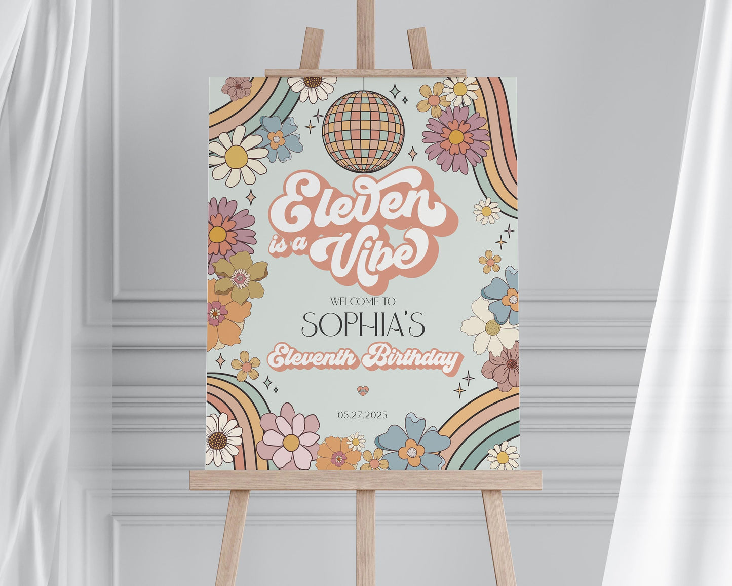 Eleven is a Vibe Groovy Floral 11th Birthday Welcome Sign Template, retro 70s Birthday, groovy girl hippie eleventh birthday party