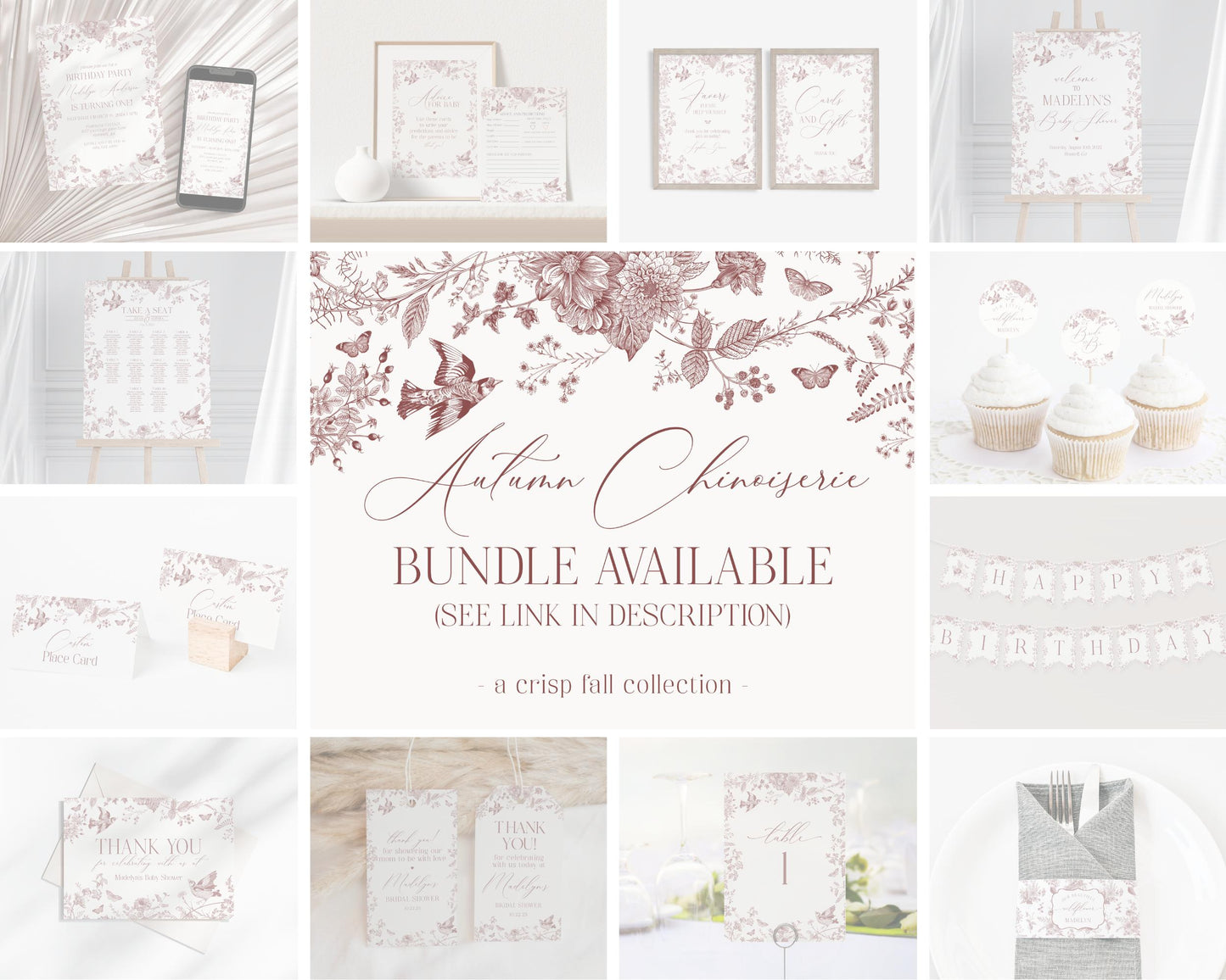 Fall Toile Baby Shower Printable Bundle, Burgundy chinoiserie baby shower decor September October November Autumn French Toile De Jouy