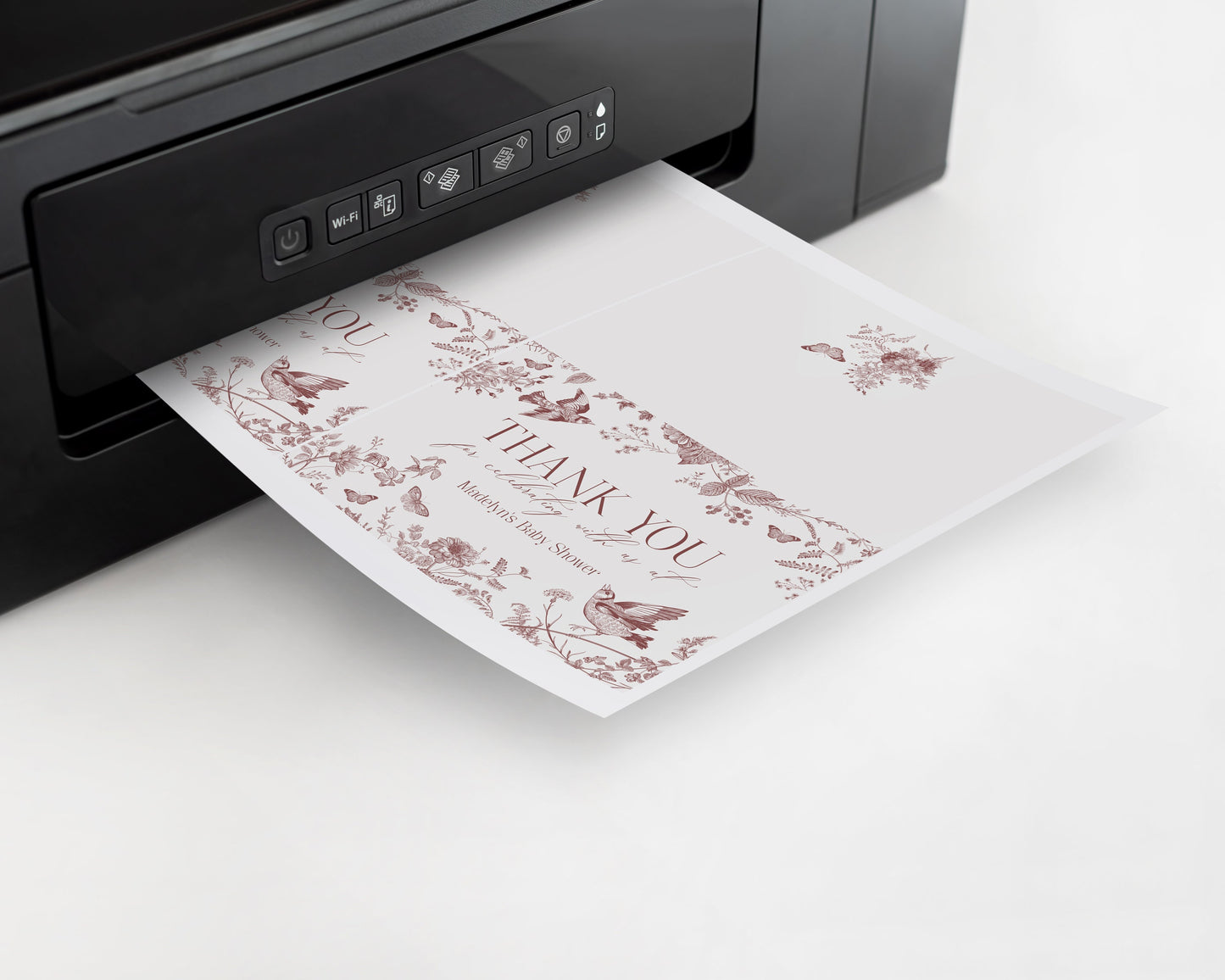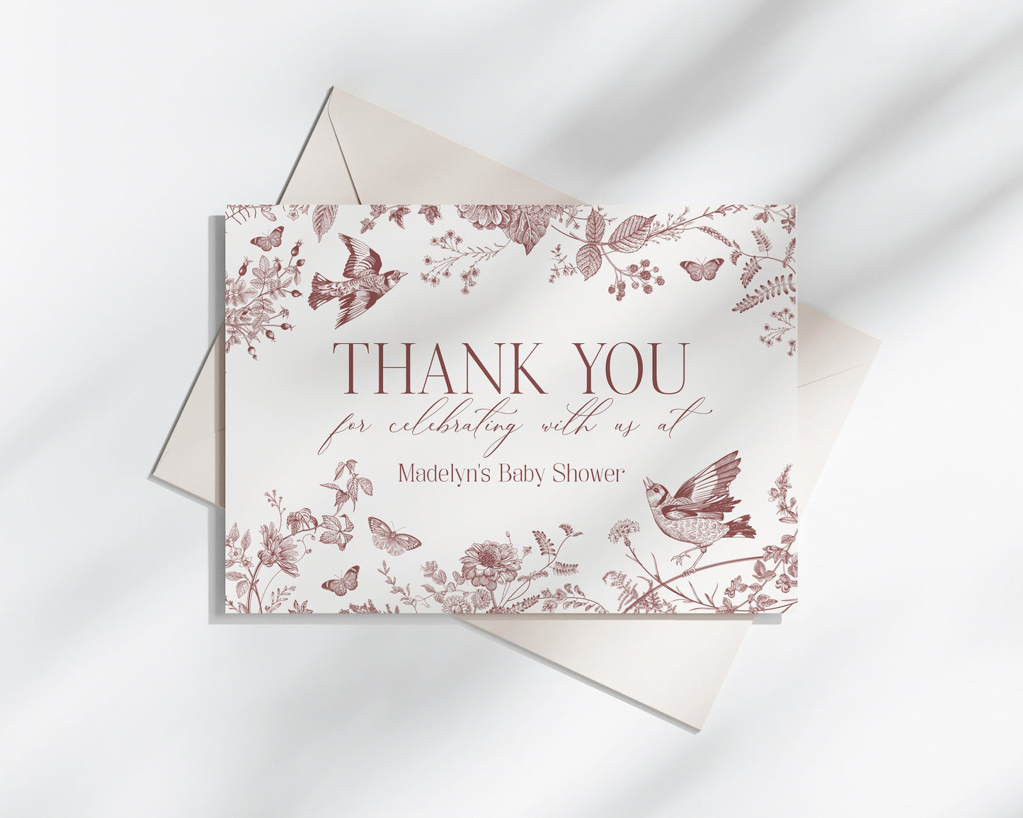 Fall Toile De Jouy Thank You Card Printable Template, Burgundy Chinoiserie Bridal Shower or Baby Shower for September October Wedding French