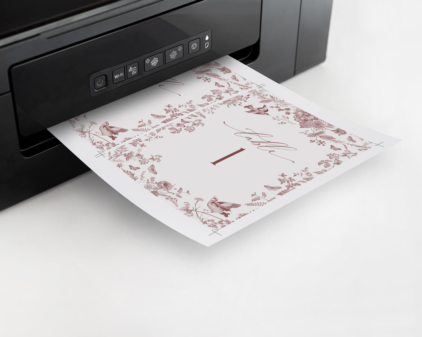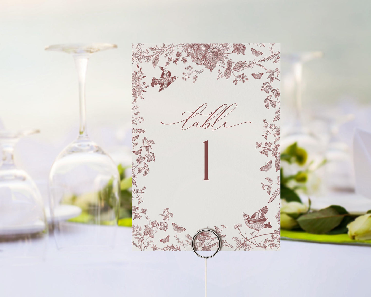 Fall Toile Table Number Cards Printable Template, Burgundy Chinoiserie Wedding for September October November French Toile De Jouy
