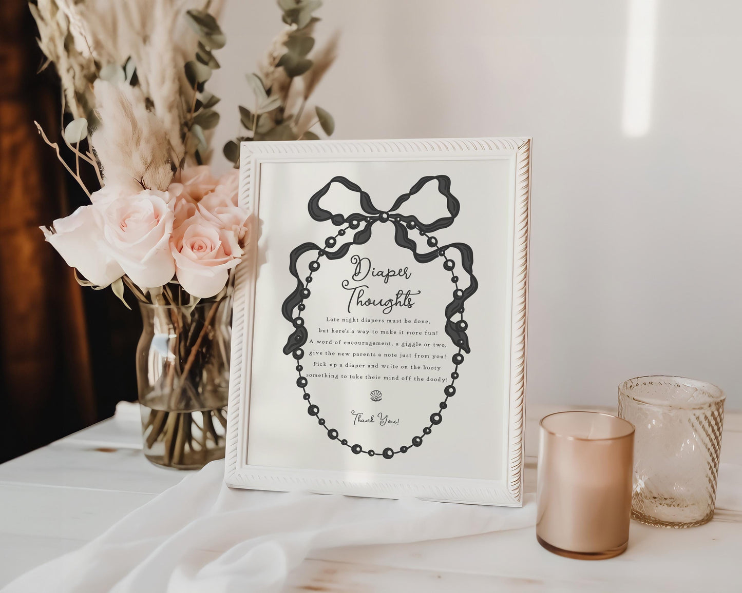 French Theme Baby Shower Diaper Thoughts Sign Printable Template, Whimsical Ribbon Black Bow Baby Sprinkle Decor for Black and White WP1002