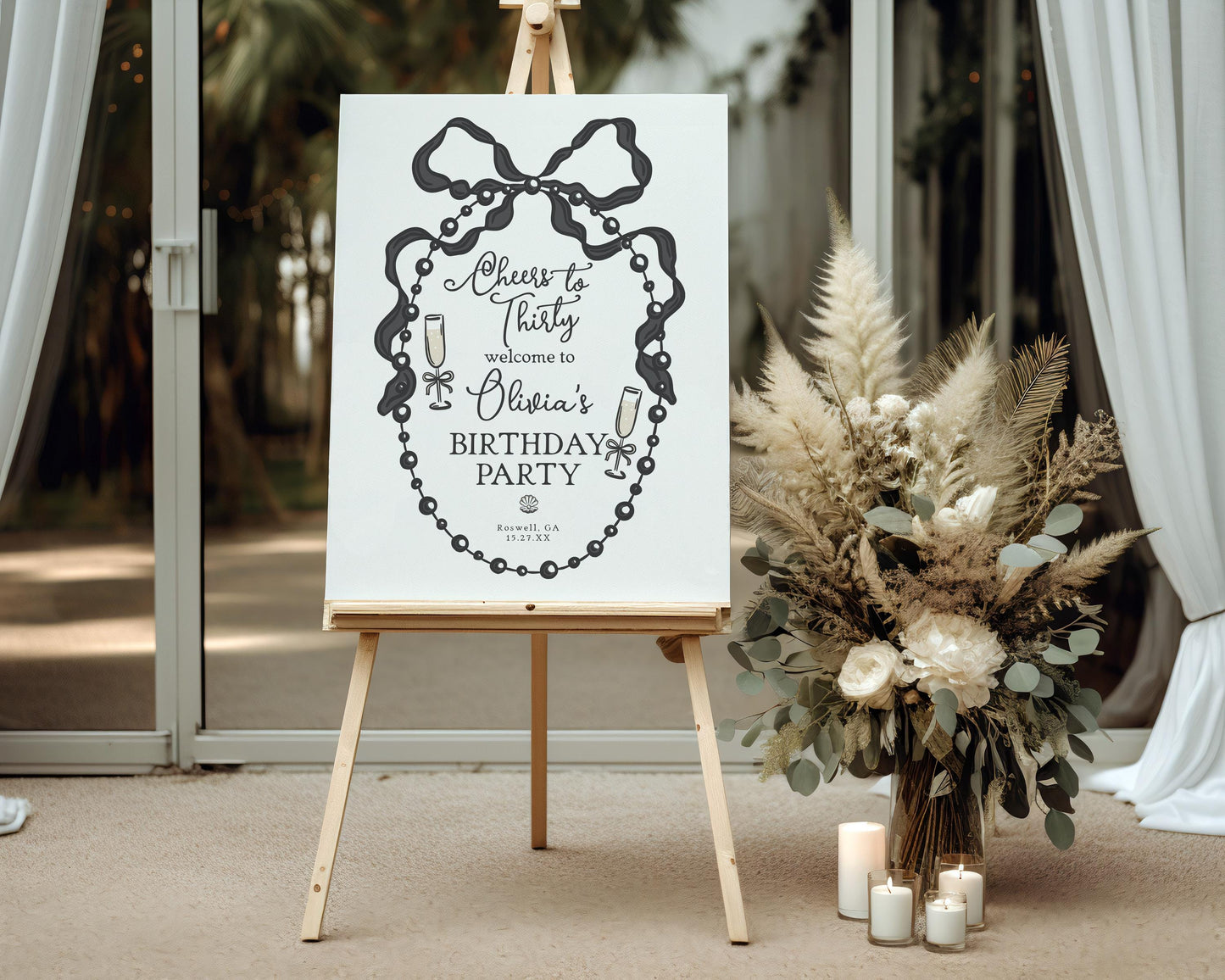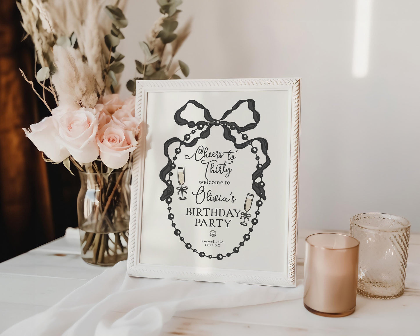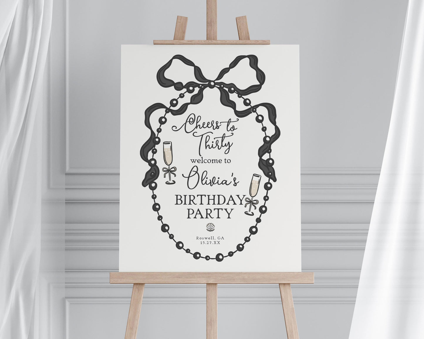 French Theme Champagne Birthday Welcome Sign Printable Template, Cheers Whimsical Ribbon Black Bow Birthday Party Decor for 30th Bday WP1002