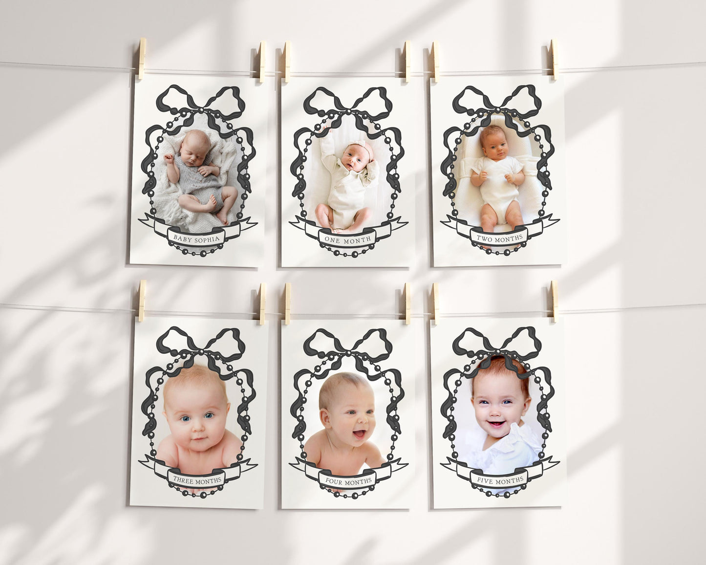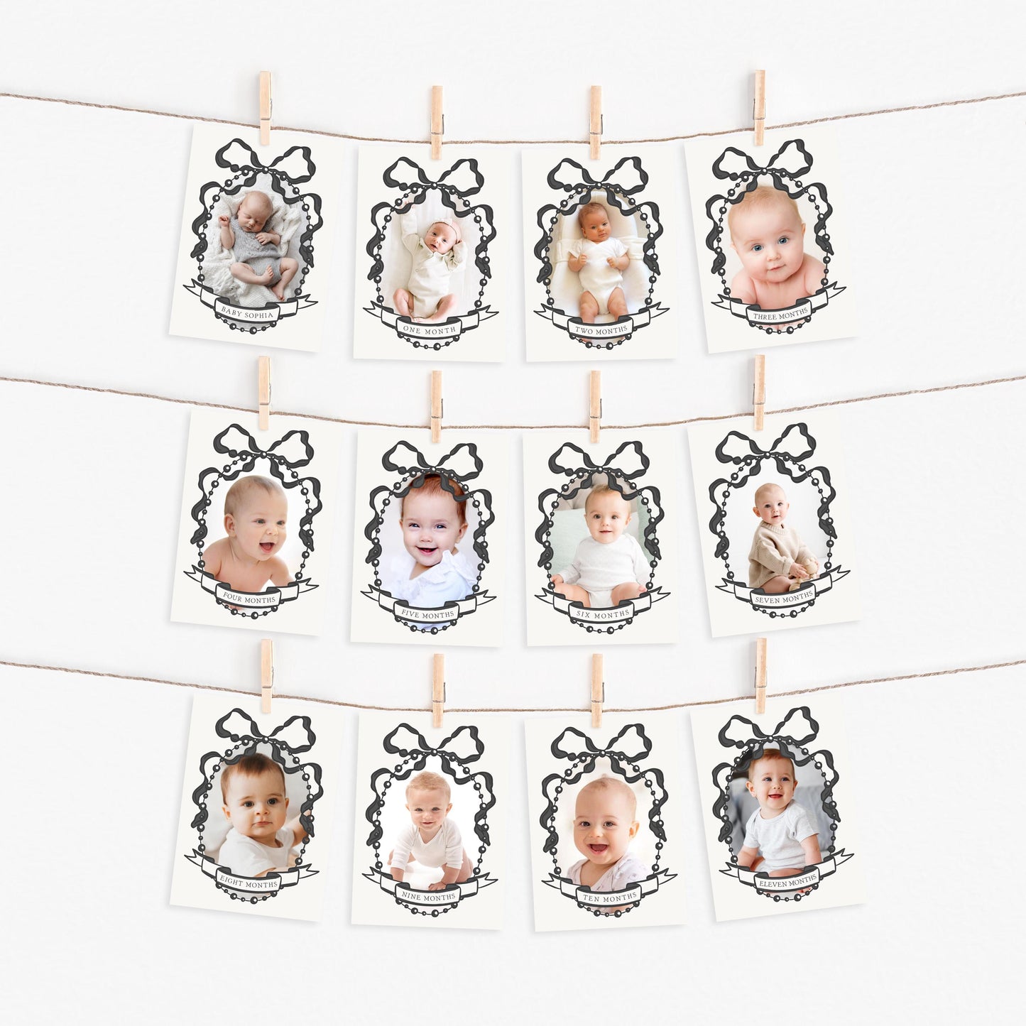 French Theme Little Pearl 1st Birthday Milestone Banner Printable Template, Whimsical Black Bow 1st Birthday Party Decor Girl Bday WP1002