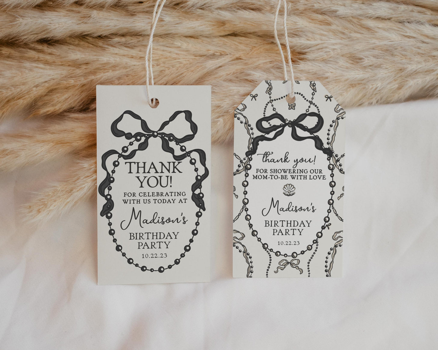French Theme Little Pearl Baby Shower Favor Tags Printable Template, Whimsical Ribbon Black Bow Baby Sprinkle Decor for Black White WP1002