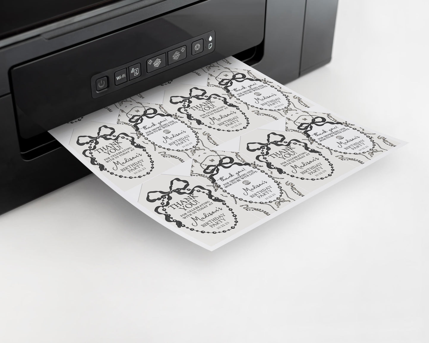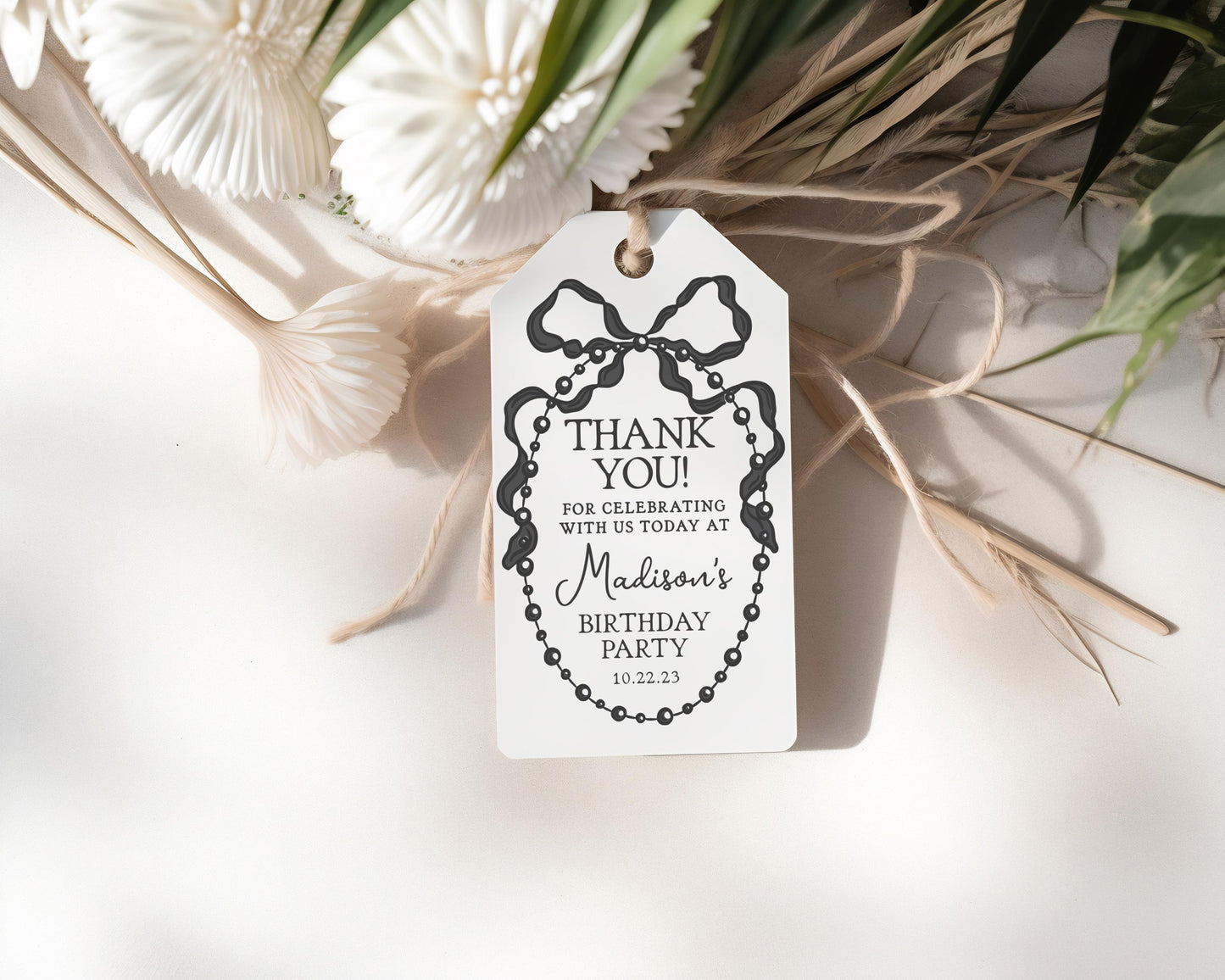 French Theme Little Pearl Birthday Favor Tags Printable Template, Whimsical Ribbon Black Bow Birthday Party Decor for Girl Bday WP1002