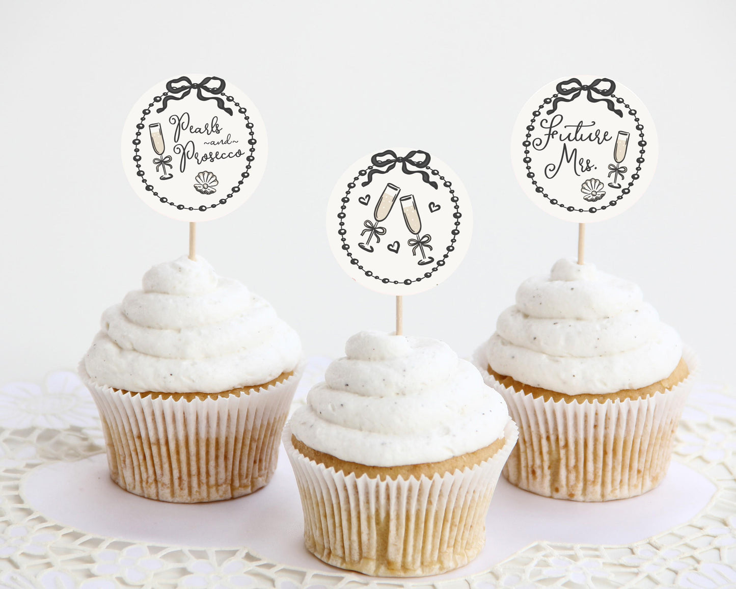 French Theme Pearls and Prosecco Bridal Shower Cupcake Toppers Printable
