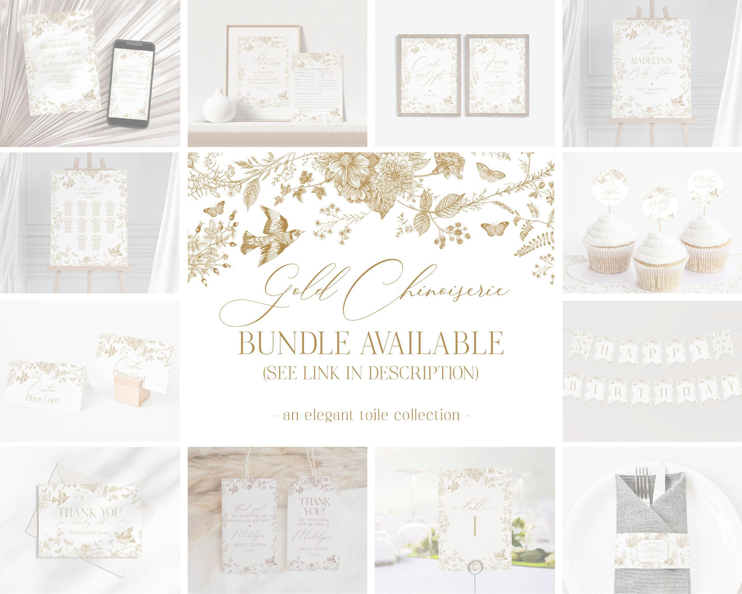 Gold Toile De Jouy Birthday Bundle Printable Template, Vintage Gold Chinoiserie Birthday Party for French Country Regency Party Decor