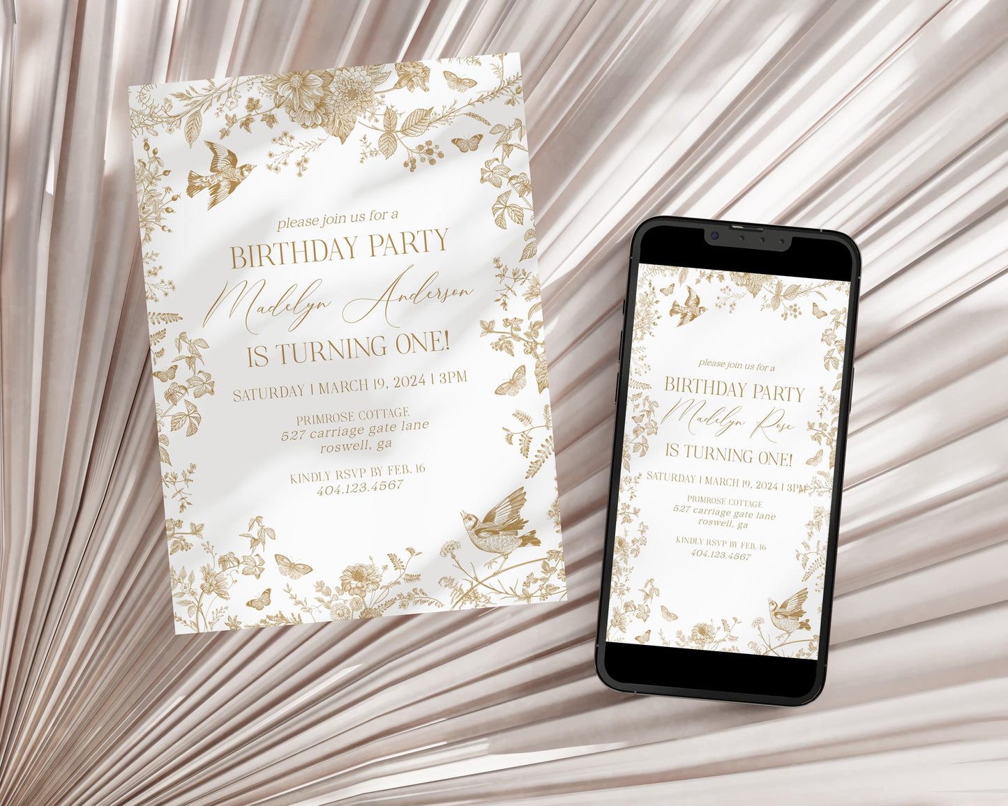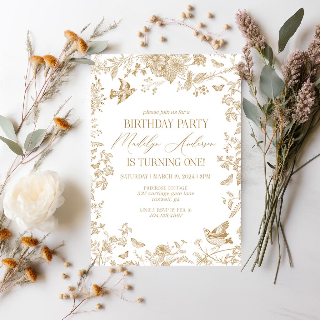 Gold Toile De Jouy Birthday Invitation Printable Template, Vintage Gold Chinoiserie Birthday Party for French Country Regency Party Decor