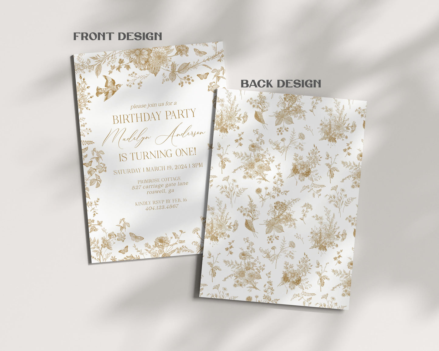 Gold Toile De Jouy First Birthday Bundle Printable Template, Vintage Gold Chinoiserie 1st Birthday for French Country Regency Party Decor